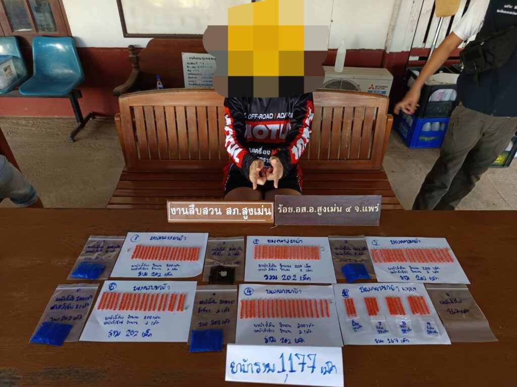 เวลาประมาณ 15.00 น.ร่วมกับ นายบรรเจิด ดวงดาว กำนันตำบลหัวฝาย นายจิณณวัตร ดังดี ผช.ผญบ.หมู่ที่ 6 ต.หัวฝาย เจ้าหน้าที่ รพ.สต.ป่าผึ้ง เข้าร่วมกันจับกุม น.ส.จิรประภา หรือเอฟ อายุ 34 ปี และร่วมกันตรวจค้นภายในห้องนอนและภายในลำตัว พบยาบ้าซุกซ่อน จำนวน 1,177 เม็ด สถานที่จับกุม บ้านเลขที่ 93 หมู่ที่ 6 ต.หัวฝาย อ.สูงเม่น จ.แพร่