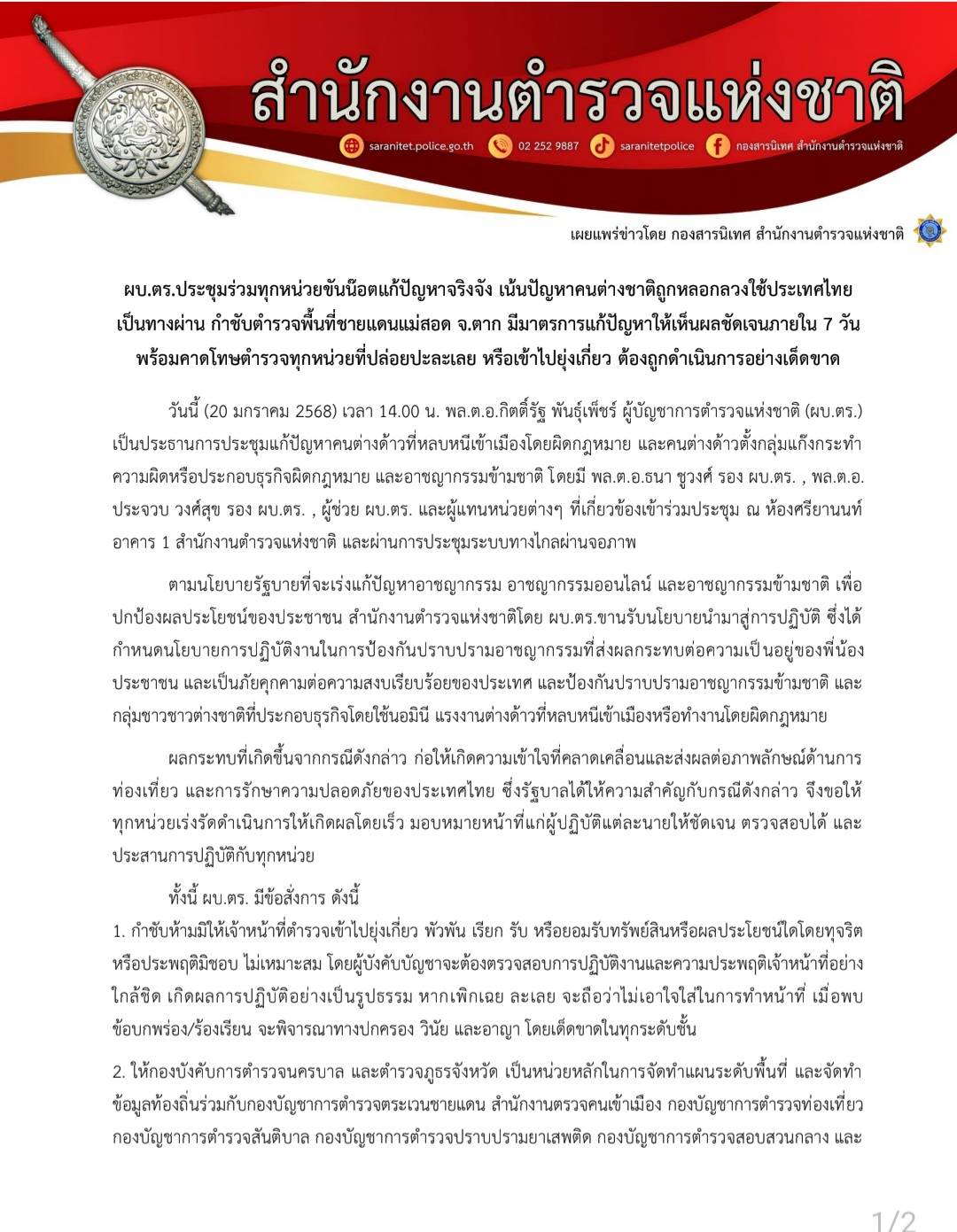 (มีคลิป)ผบ.ตร.ประชุมร่วมทุกหน่วยขันน๊อตแก้ปัญหาจริงจัง เน้นปัญหาคนต่างชาติถูกหลอกลวงใช้ประเทศไทยเป็นทางผ่าน กำชับตำรวจพื้นที่ชายแดนแม่สอด จ.ตาก มีมาตรการแก้ปัญหาให้เห็นผลชัดเจนภายใน 7 วัน พร้อมคาดโทษตำรวจทุกหน่วยที่ปล่อยปะละเลย หรือเข้าไปยุ่งเกี่ยว ต้องถูกดำเนินการอย่างเด็ดขาด