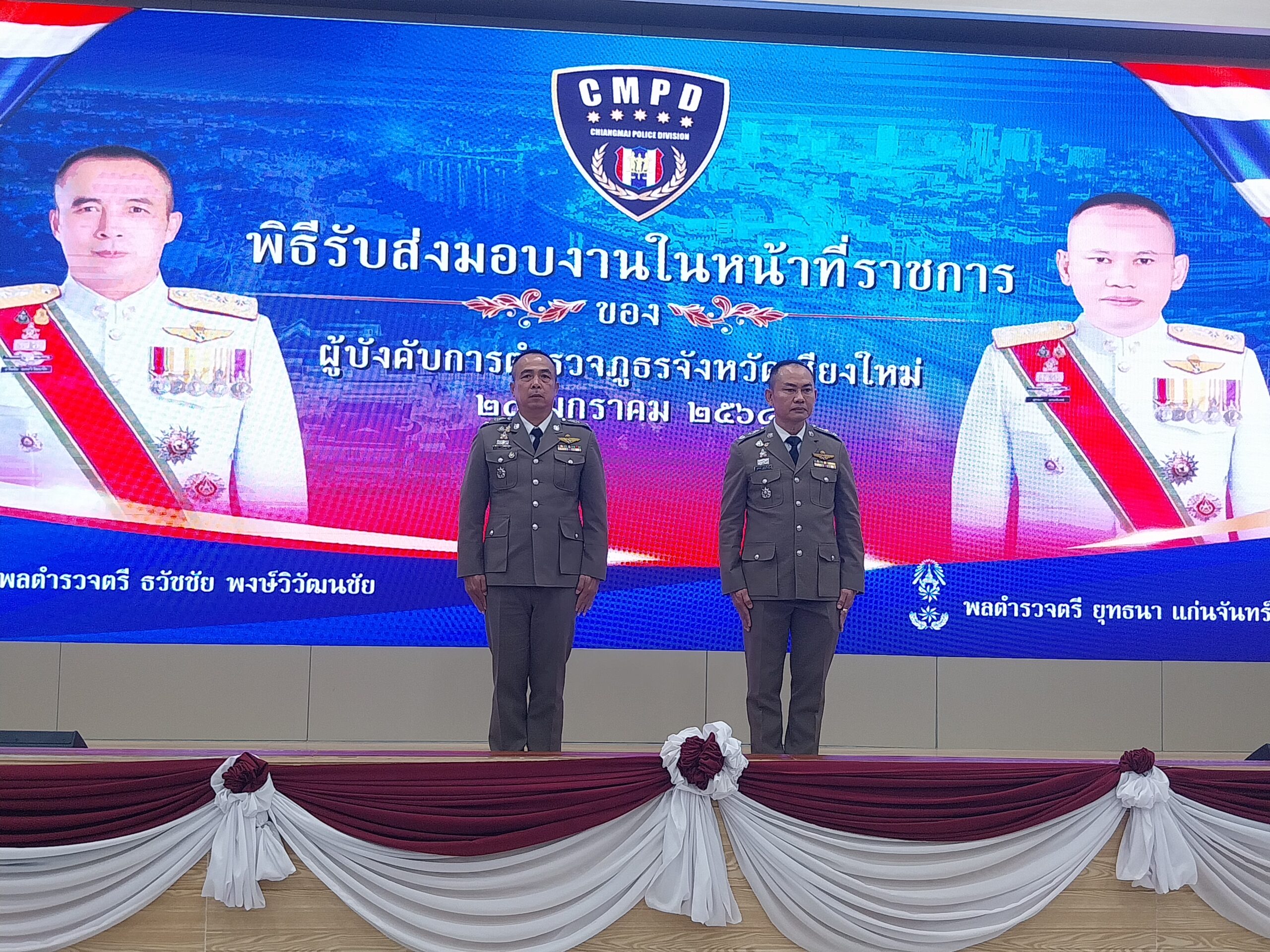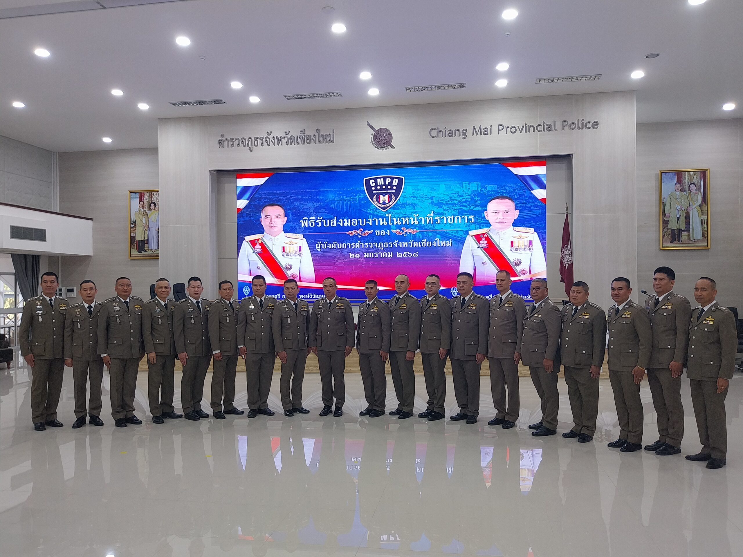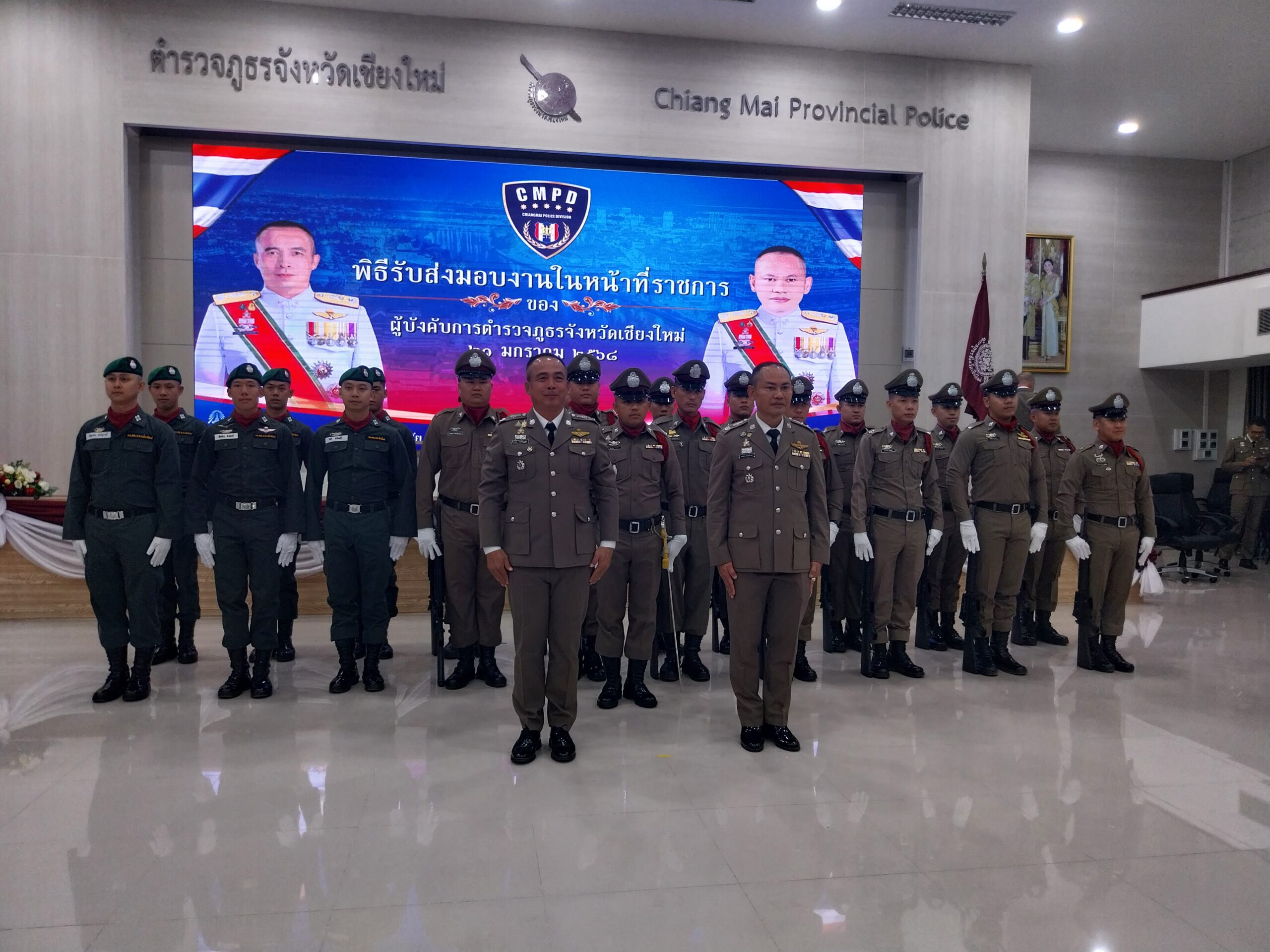 หลังจากนั้น เวลา 09.00 น. พิธี ส่ง – มอบ ตำแหน่ง ผบก.ภ.จว.เชียงใหม่ โดยพล.ต.ต.ธวัชชัย พงษ์วิวัฒนชัย รรท.รองผู้บัญชาการตำรวจภูธรภาค 5 ได้ทำพิธีส่งมอบตำแหน่งให้กับพล.ต.ต.ยุทธนา แก่นจันทร์ รรท.ผู้บังคับการตำรวจภูธรจังหวัดเชียงใหม่ โดยมอบธงประจำหน่วยพร้อมอ่านคำสั่งสำนักงานตำรวจแห่งชาติ