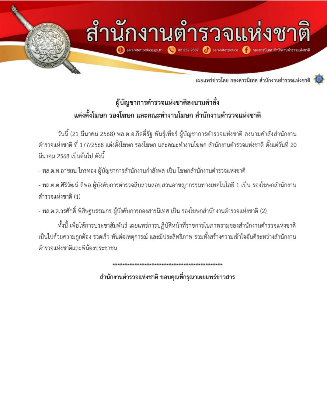 วันนี้ (21 มีนาคม 2568) พล.ต.อ.กิตติ์รัฐ พันธุ์เพ็ชร์ ผู้บัญชาการตำรวจแห่งชาติ ลงนามคำสั่งสำนักงานตำรวจแห่งชาติ ที่ 177/2568 แต่งตั้งโฆษก รองโฆษก และคณะทำงานโฆษก สำนักงานตำรวจแห่งชาติ ตั้งแต่วันที่ 20 มีนาคม 2568 เป็นต้นไป ดังนี้