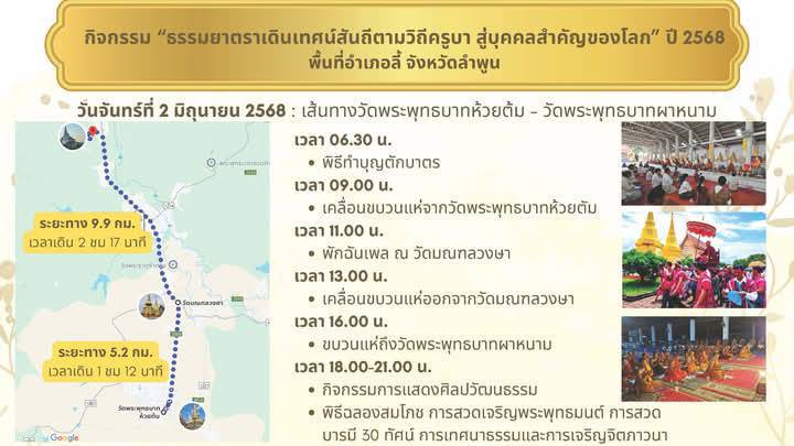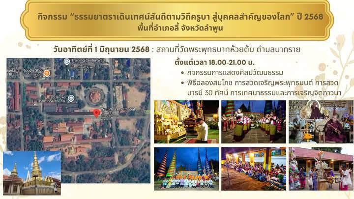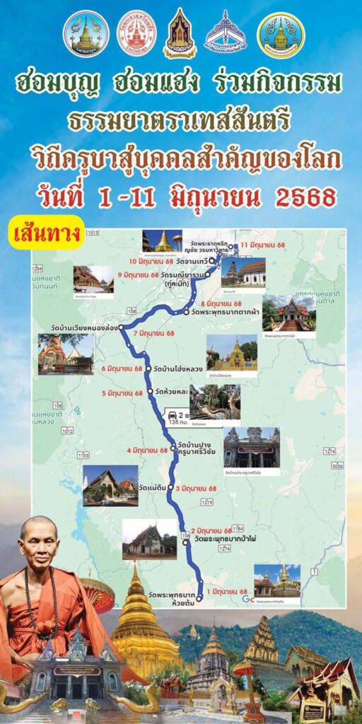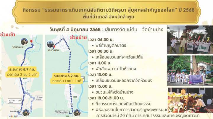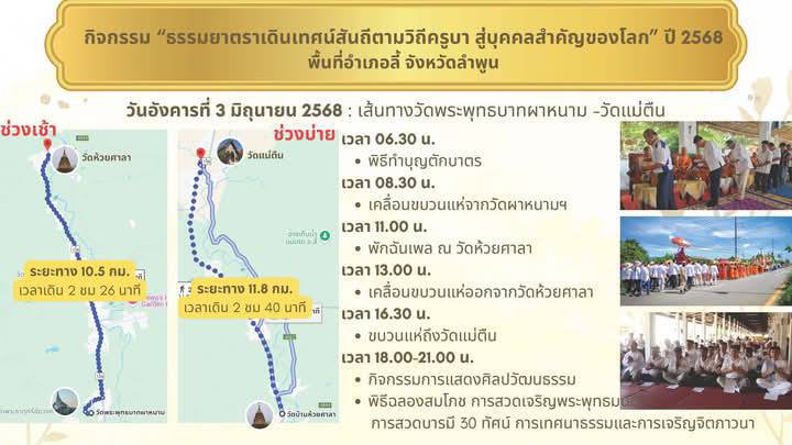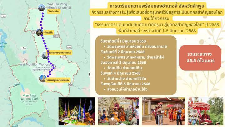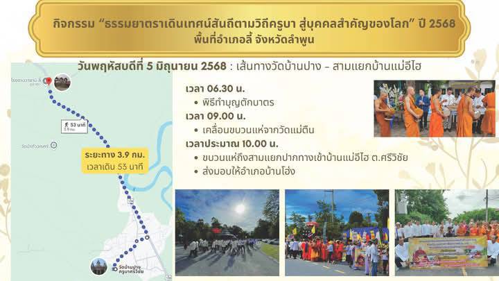 เชิญพุทธศาสนิกชนร่วมกิจกรรม “ธรรมยาตราเดินเทศน์สันถี ตามวิถีครูบาสู่บุคคลสำคัญของโลก” ปี 2568 (ปีที่ 3) มีเส้นทางการเดินขบวนครอบคลุมอำเภอลี้ บ้านโฮ่ง เวียงหนองล่อง ป่าซาง และอำเภอเมืองลำพูน ซึ่งในที่ประชุมครั้งนี้ ทั้ง 5 อำเภอ ได้สรุปแผนงานและการเตรียมความพร้อมแจ้งให้กับที่ประชุม ส่วนความคืบหน้าในการประชุมครั้งนี้ มีการแจ้งถึงหัวข้อธรรมในการแสดงพระธรรมเทศนาในแต่ละวัน ดังนี้