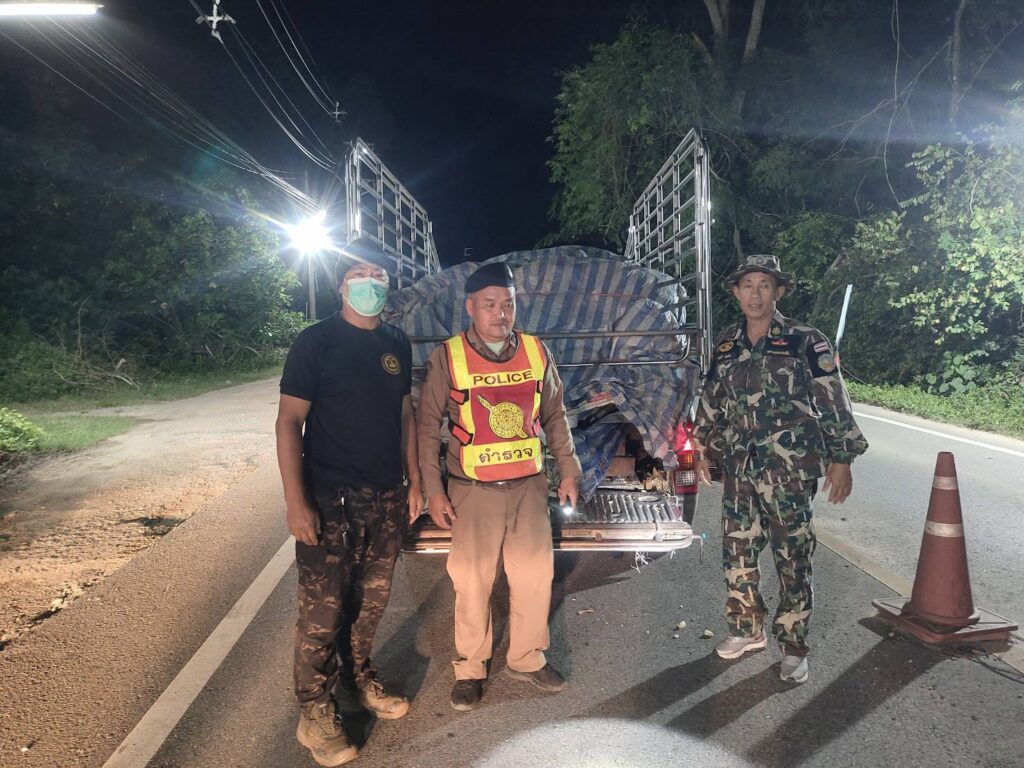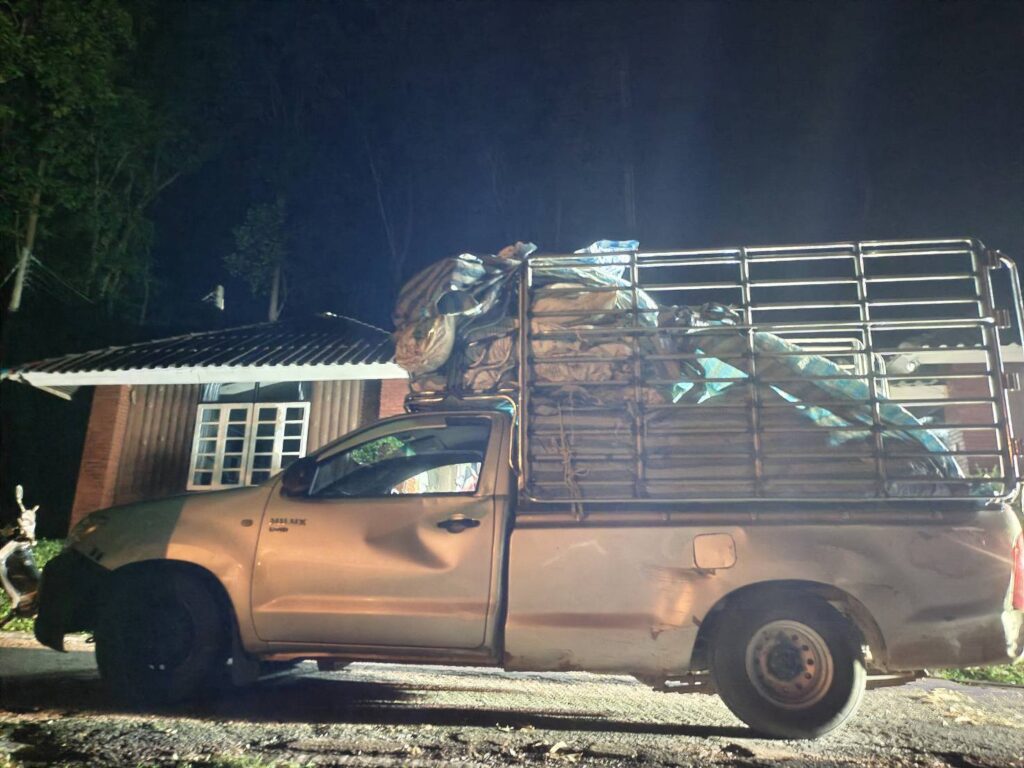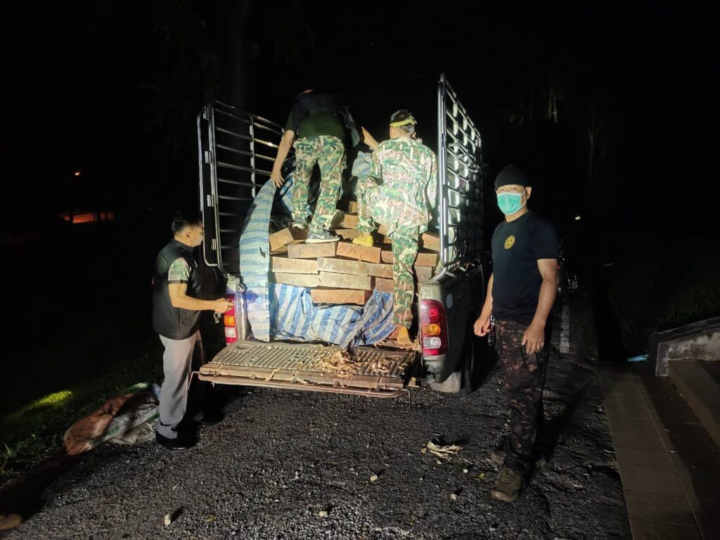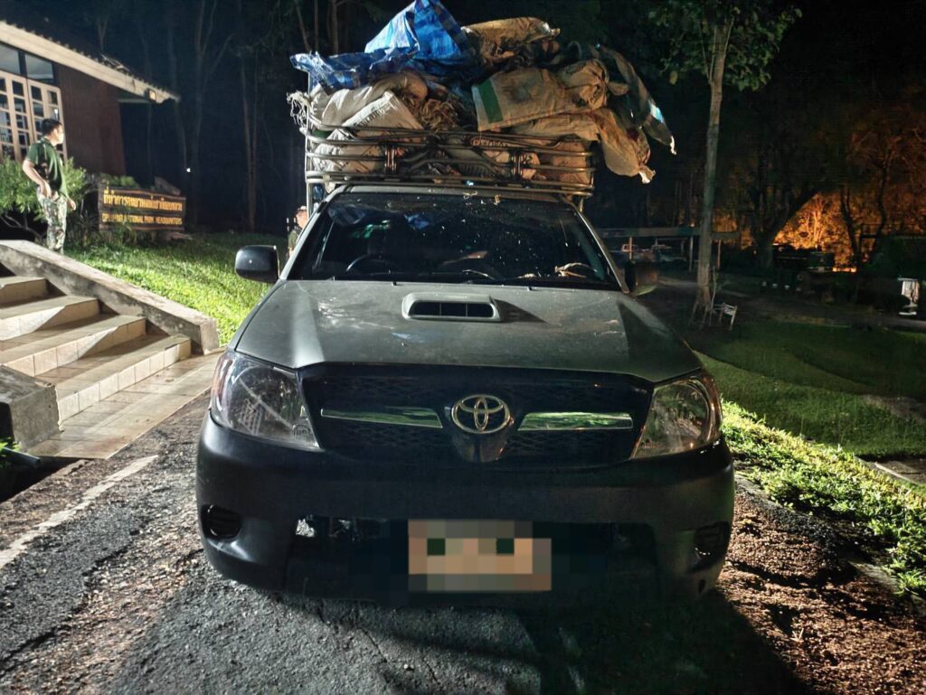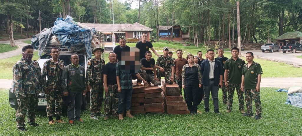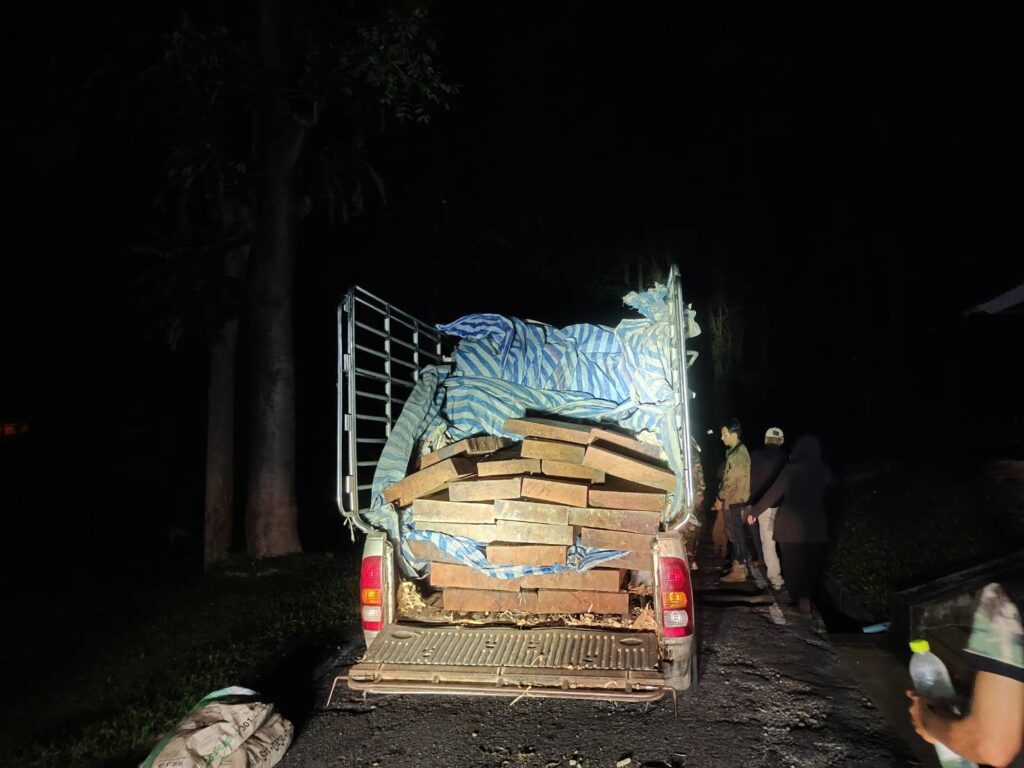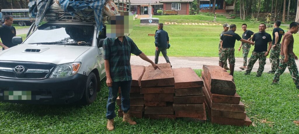 กระทั่งเวลา 03.30 น. ของวันที่ 21 มิ.ย. 68 มีรถบรรทุกลักษณะตรงตามที่ได้รับแจ้งขับออกมาจากบ้านแม่หืด ผ่านจุดที่เจ้าหน้าที่ชุดที่ 1 ดักซุ่มอยู่ แต่เนื่องจากรถคันดังกล่าว ขับเร็ว ไม่สามารถสกัดได้ เจ้าหน้าที่ชุดที่ 1 จึงได้ประสานเจ้าหน้าที่ชุดที่ 2 เพื่อสกัด เมื่อเวลา 04.00 น. เจ้าหน้าที่ชุดที่ 2 สังเกตเห็นรถตามลักษณะที่ได้รับแจ้งขับผ่านเข้ามา จึงได้แสดงตัวเป็นเจ้าหน้าที่ เรียกให้รถยนต์หยุด และขออนุญาตเข้าตรวจค้นรถยนต์ส่วนบุคคล ยี่ห้อโตโยต้า วีโก้ สีเทา หมายเลขทะเบียน ผน 2452 เชียงใหม่ (ติดป้ายทะเบียนทั้งด้านหน้าและด้านหลัง) ติดตั้งเสริมโครงเหล็ก ลักษณะรถยนต์มีร่องรอย การเฉี่ยวชน บริเวณประตู และด้านท้ายกะบะรถของฝั่งด้านข้างผู้ขับขี่ บริเวณด้านท้ายกะบะซึ่งมีผ้าเต็นท์ลายตารางสีฟ้าขาว ปกคลุม เจ้าหน้าที่จึงได้ทำการตรวจสอบพบเป็นไม้ประดู่ ผู้ขับขี่รถยนต์ทราบชื่อนายคมสรรค์ (ขอสงวนนามสกุล) บ้านเลขที่ 193 หมู่ที่ 4 ตำบลบ้านแปะ อำเภอจอมทอง จังหวัดเชียงใหม่ อายุ 46 ปี นายคมสรรค์ฯ ไม่มีเอกสาร ใดๆ กำกับไม้ประดู่ที่ขนย้ายดังกล่าว ซึ่งเป็นไม้ที่ได้มาโดยผิดกฎหมาย เจ้าหน้าที่จึงได้ควบคุมตัวนายคมสรรค์ฯ พร้อมรถยนต์บรรทุกไม้ประดู่ นำมาที่อุทยานแห่งชาติออบหลวงได้ทำการตรวจสอบ