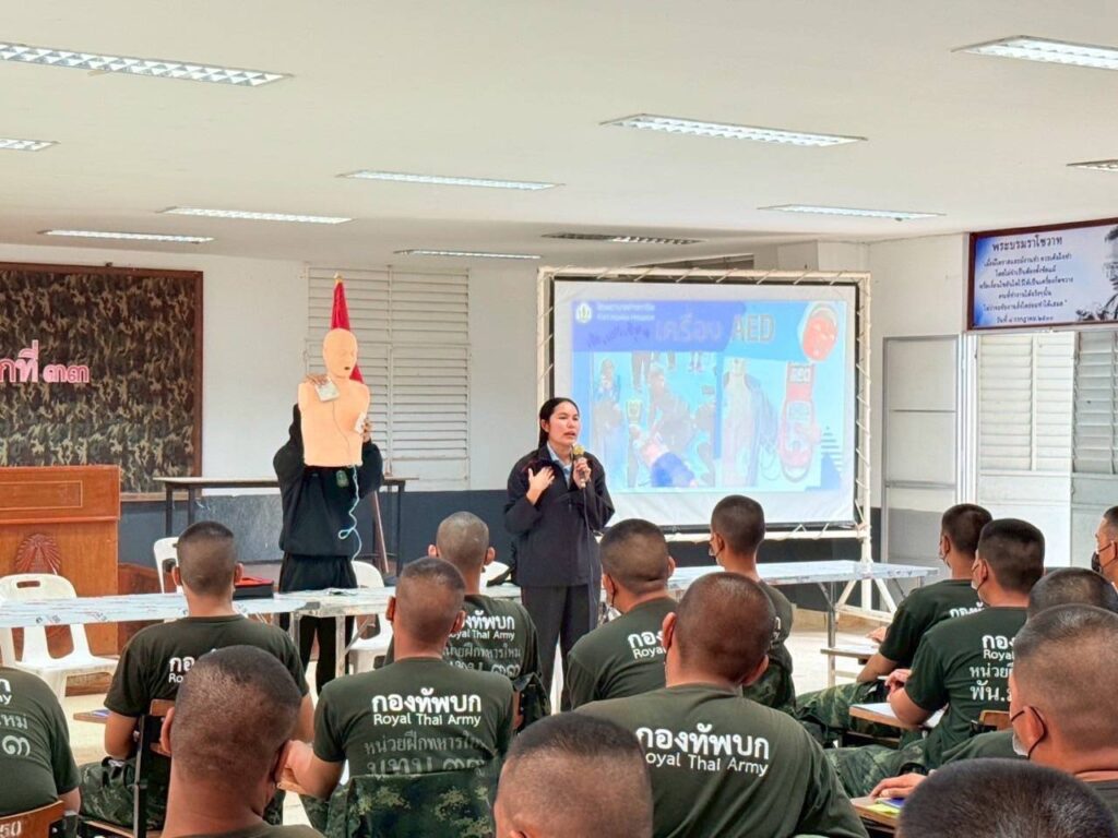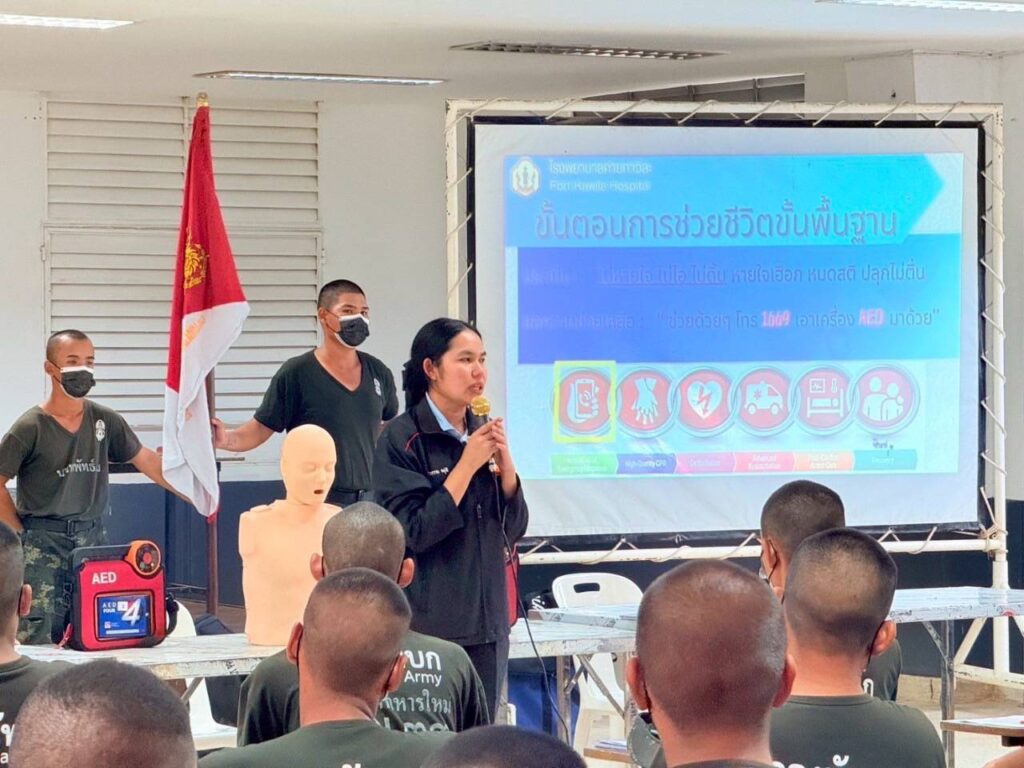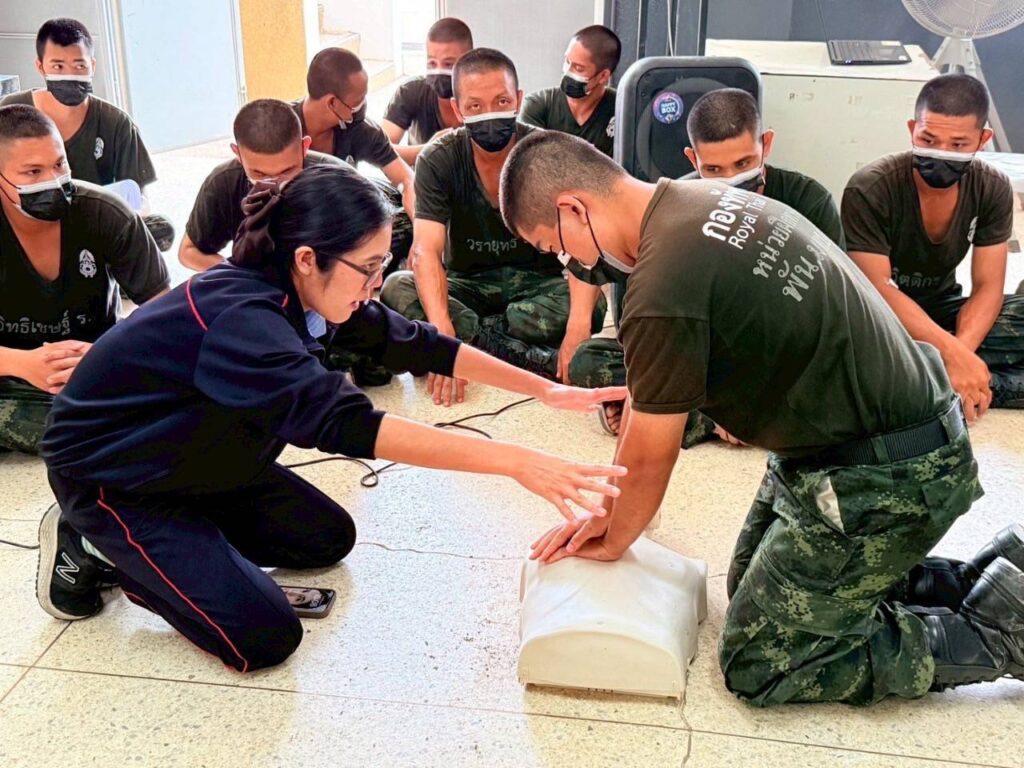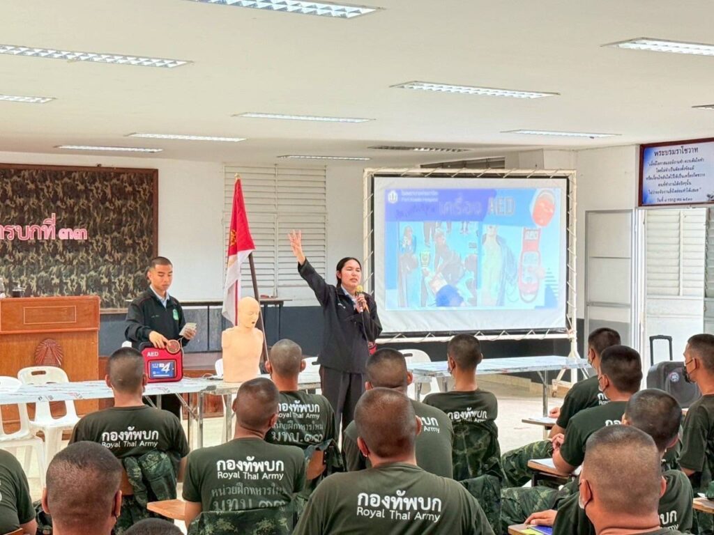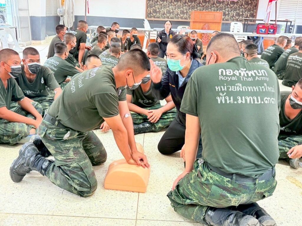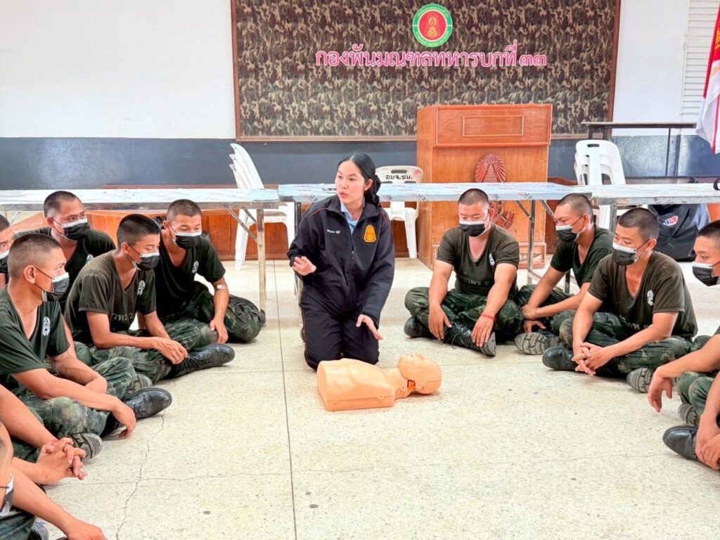 โดยทีมส่งเสริมสุขภาพและเวชกรรมป้องกัน ได้มีการให้ความรู้ สาธิต ในการปฐมพยาบาลเบื้องต้นให้กับผู้ป่วยเจ็บ ก่อนเคลื่อนย้ายผู้ป่วยส่งสถานพยาบาล การสอน และทบทวนวิธีการปฏิบัติการช่วยฟื้นคืนชีพด้วยวิธีปั๊มหัวใจ (CPR) ร่วมกับการใช้อุปกรณ์ช่วยเหลือ เครื่องกระตุ้นไฟฟ้าหัวใจอัตโนมัติ (AED) ให้กับน้องๆ ทหารใหม่ มทบ.33 และ พัน.มทบ.33 ทุกนาย ได้รับความรู้ มีความชำนาญในการช่วยเหลือตนเอง หรือเพื่อนร่วมฝึกเมื่อเกิดอุบัติเหตุระหว่างการฝึกสามารถช่วยเหลือกันเบื้องต้นได้ และเมื่อเจอประชาชนที่ประสบอุบัติเหตุจริง สามารถเข้าช่วยเหลือประชาชน ได้ทันท่วงที เพราะหน่วยทหารเป็นที่พึ่งของประชาชนในทุกโอกาส และเนื่องจากที่ผ่านมาหากผู้ประสบเหตุไม่ได้รับการช่วยเหลือ และปฐมพยาบาลเป็นการเบื้องต้นก่อนนำส่งโรงพยาบาล จะมีอัตราเสียชีวิตเพิ่มขึ้น เพราะการทําให้ผู้บาดเจ็บได้รับ การรักษาโดยเร็วที่สุด ถูกต้องที่สุด เป็นปัจจัยสําคัญที่จะทําให้ผู้บาดเจ็บมีชีวิตรอด