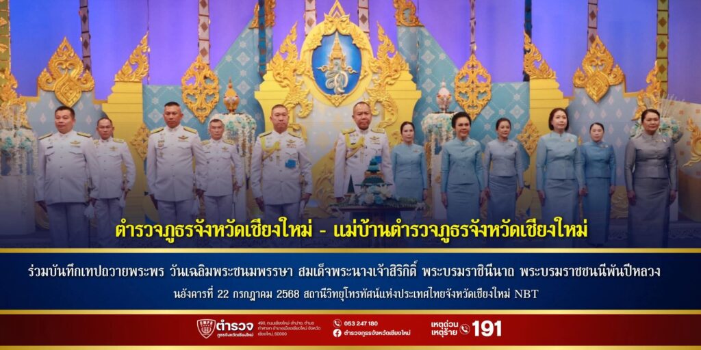 วันอังคารที่ 22 กรกฎาคม 2568 เวลา 11.00 น. พล.ต.ต.ยุทธนา แก่นจันทร์ ผบก.ภ.จว.เชียงใหม่ พร้อมด้วย คุณจารุณี แก่นจันทร์ ประธานแม่บ้านตำรวจภูธรจังหวัดเชียงใหม่ ร่วมบันทึกเทปถวายพระพร วันเฉลิมพระชนมพรรษา สมเด็จพระนางเจ้าสิริกิติ์ พระบรมราชินีนาถ พระบรมราชชนนีพันปีหลวง วันที่ 12 ส.ค.68 ณ สถานีวิทยุ NBT เชียงใหม่ โดยมี พล.ต.ท.กฤตธาพล ยี่สาคร ผบช.ภ.5 เป็นผู้นำการบันทึกเทปฯ เพื่อแสดงความจงรักภักดี และสำนึกในพระมหากรุณาธิคุณ