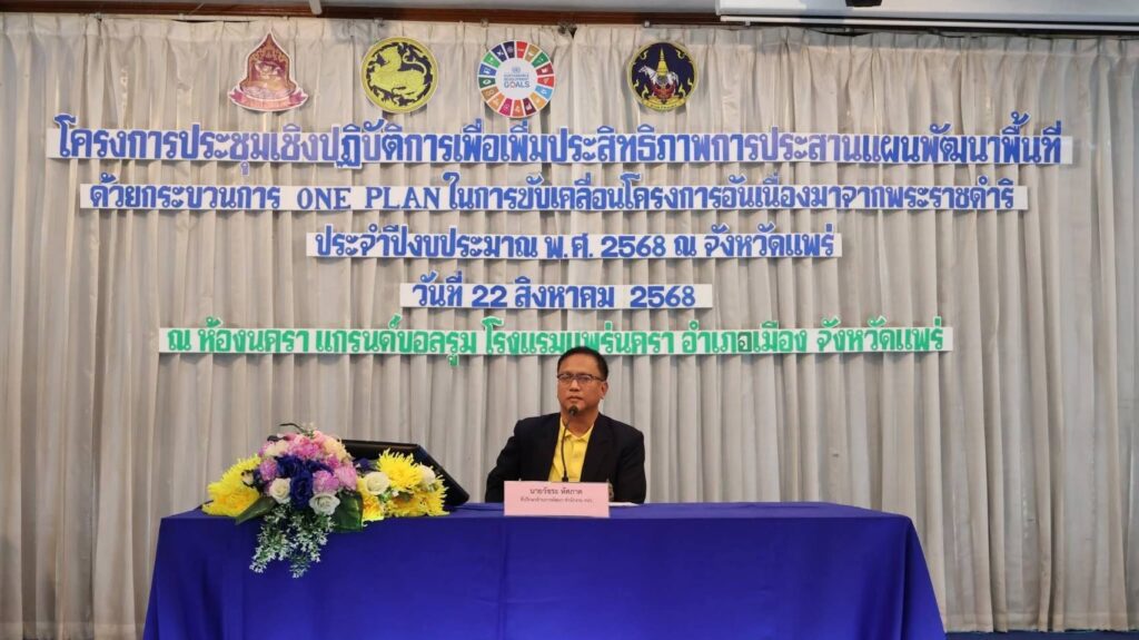 เมื่อวันที่ 22 สิงหาคม 2568 ณ ห้องประชุมนคราแกรนด์ บอลรูม ชั้น 2 โรงแรมแพร่นครา อำเภอเมืองแพร่ จังหวัดแพร่ นายสมชัย เลิศประสิทธิพันธ์ ผู้ว่าราชการจังหวัดแพร่ ได้กล่าวต้อนรับที่ปรึกษา อนุกรรมการติดตามและขับเคลื่อนโครงการอันเนื่องมาจากพระราชดำริ โดย นายวัชระ หัศภาค ที่ปรึกษาด้านการพัฒนา สำนักงาน กปร. ที่เป็นประธานเปิด “โครงการประชุมเชิงปฏิบัติการเพื่อเพิ่มประสิทธิภาพการประสานแผนพัฒนาพื้นที่ด้วยกระบวนการ One plan ในการขับเคลื่อนโครงการอันเนื่องมาจากพระราชดำริ” โดยสำนักงานคณะกรรมการพิเศษเพื่อประสานงานโครงการอันเนื่องมาจากพระราชดำริ (สำนักงาน กปร.) ร่วมกับกระทรวงมหาดไทยจัดขึ้น