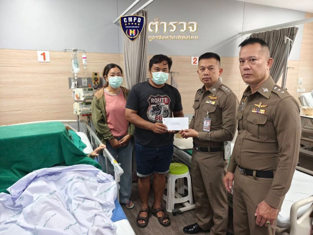 เชียงใหม่-ผบก.ภ.จว.เชียงใหม่ จัดผู้แทนมอบกระเช้าผลไม้ และเงินช่วยเหลือเบื้องต้น เพื่อเป็นขวัญและกำลังใจให้กับผู้เสียหายและครอบครัวเด็กหญิงถูกแก๊งไทใหญ่ฟันมือขวาขาด
