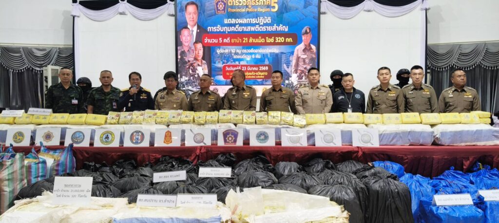 เมื่อวันที่ 23 มีนาคม 2569 สำนักงานตำรวจแห่งชาติ โดยกองบัญชาการตำรวจภูธรภาค 5 แถลงผลการจับกุมยาเสพติดรายสำคัญรวม 5 คดี จับกุมผู้ต้องหาได้ทั้งหมด 10 คน พร้อมของกลางยาบ้า 21 ล้านเม็ด และไอซ์ 320 กิโลกรัม ซึ่งเป็นการบูรณาการร่วมกันระหว่างตำรวจ ทหาร และฝ่ายปกครอง ตามนโยบายเร่งด่วนของรัฐบาล