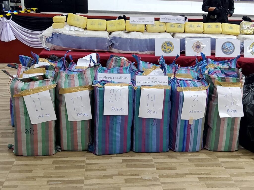 คดีแรก เกิดขึ้นเมื่อวันที่ 17 มีนาคม 2569 ที่อำเภอเชียงของ จังหวัดเชียงราย เจ้าหน้าที่ตั้งจุดตรวจพบรถจักรยานยนต์ 3 คันขับนำรถยนต์อเนกประสงค์เชฟโรเลต เมื่อเรียกตรวจรถยนต์คันดังกล่าวกลับเร่งเครื่องหลบหนีและนำรถไปจอดทิ้งไว้ ตรวจสอบภายในรถพบยาบ้า 24 กระสอบ รวมประมาณ 7 ล้านเม็ด สอบสวนผู้ต้องหาที่ขี่รถจักรยานยนต์นำทางสารภาพว่าลำเลียงยามาจากชายฝั่งแม่น้ำโขงเพื่อไปส่งที่อำเภอภูซาง จังหวัดพะเยา