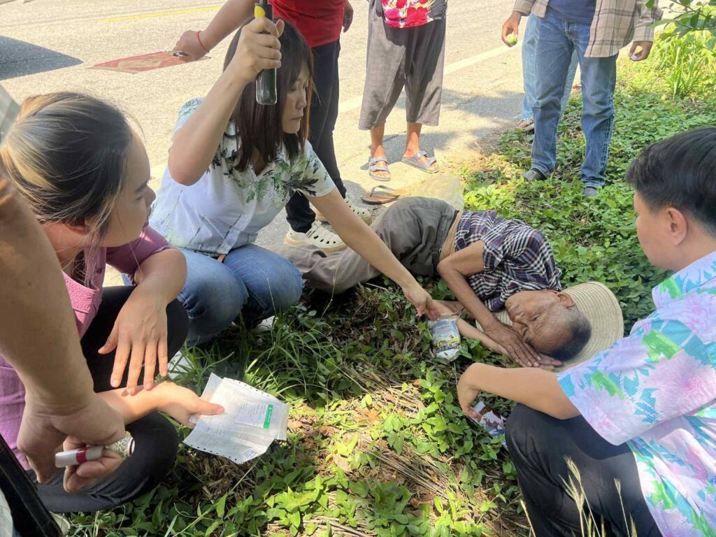 นายนิรันดร์ พรมละ ปลัดอำเภอคนได้มองเห็นรถจักรยานยนต์ ยี่ห้อ ฮอนด้าเวฟ สีน้ำเงิน ทะเบียน สพบ-155 พระนครศรีอยุธยา พ่วงข้างจอดคว่ำอยู่จึงบอกให้คนขับรถจอดอย่างเร่งด่วน เพราะตนมองเห็นชายสูงอายุนอนสลบอยู่ เมื่อรถจอดนิ่งทุกคนต่างรีบลงจากรถเพื่อดำเนินการช่วยเหลือ ที่สำคัญ นายนิรันดร์ พรมละ ปลัดอำเภอฯ ก็ได้ปฐมพยาบาลเบื้องต้นและสั่งทีมงานให้หาร่มมากลางหายาดมมาให้คนชายสูงวัยที่ประสพเหตุด้วยความห่วงใยพร้อมโทรประสานแจ้งรถกู้ภัยเทพนิมิตรจุดศรีสัชนาลัยอย่างเร่งด่วนด้วยตนเอง พร้อมนำตัวชายสูงวัยส่งไปยังโรงพยาบาลศรีสัชนาลัยอย่างเร่งด่วนทำการรักษา