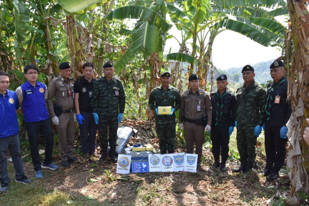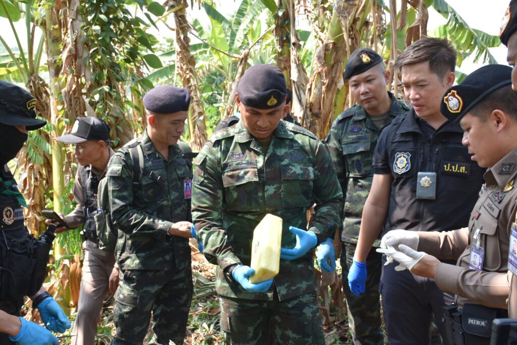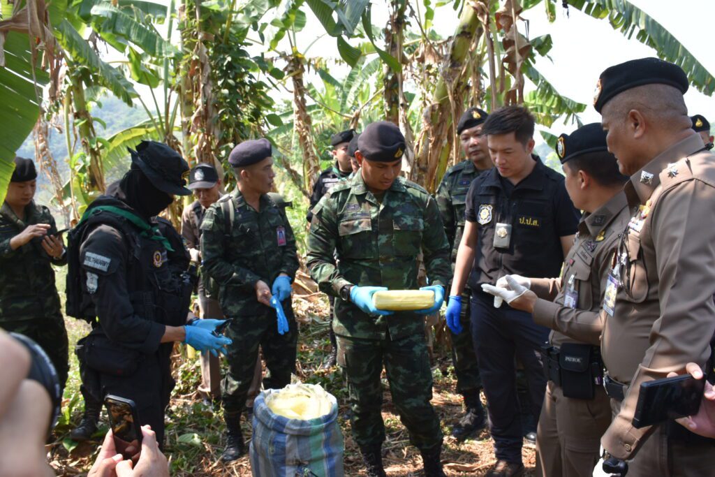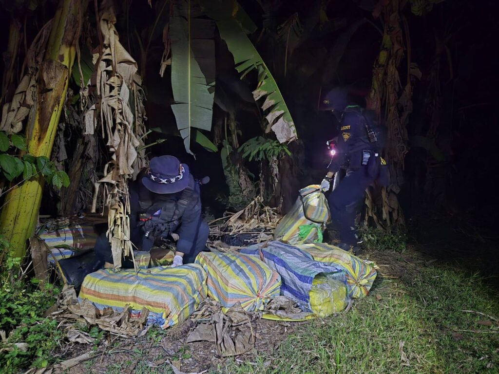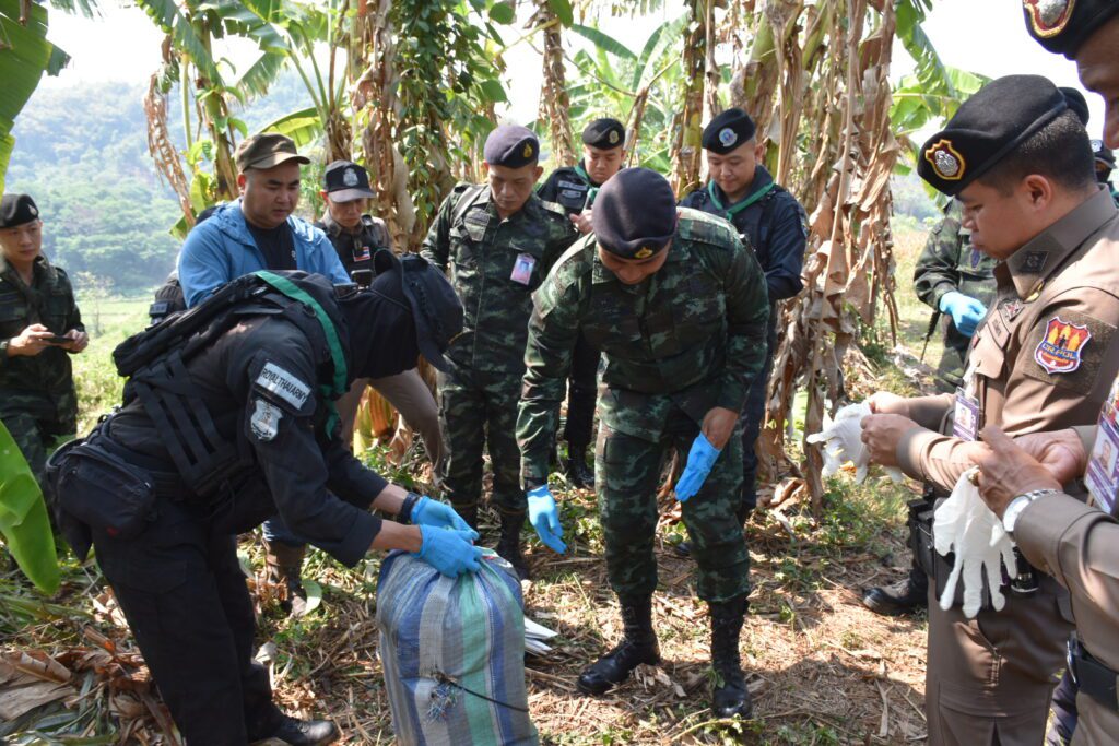 จากกรณี เมื่อวันที่ 22 เมษายน 2568 เวลา 18.00 น. กองร้อยทหารพรานที่ 3106 หน่วยเฉพาะกิจกรมทหารพรานที่ 31 ทำการตั้งจุดตรวจเพื่อป้องกันและสกัดกั้นการกระทำผิดตามพระราชบัญญัติยาเสพติด บริเวณ บ้านธรรมจาริก ตำบลแม่จัน อำเภอแม่จัน จังหวัดเชียงราย หลังจากสืบทราบว่าจะมีการลักลอบลำเลียงยาเสพติดจากพื้นที่แนวชายแดนผ่านพื้นที่ดังกล่าว ในระหว่างปฏิบัติหน้าที่ตรวจพบรถยนต์ต้องสงสัยขับเข้ามาบริเวณจุดตรวจ เจ้าหน้าที่จึงได้ส่งสัญญาณให้หยุด เพื่อขอทำการตรวจค้น แต่รถคันดังกล่าวเมื่อเห็นเจ้าหน้าที่ได้เร่งความเร็วหลบหนี จึงได้ทำการไล่ติดตาม จนพบรถยนต์ยี่ห้อ มิตซูบิชิ สีบรอนซ์เงิน หมายเลขทะเบียน ผธ 8566 เชียงราย จอดอยู่บริเวณริมถนนห่างจาก จุดตรวจระยะทางประมาณ 4.5 กิโลเมตร ไม่พบผู้ต้องสงสัย เจ้าหน้าที่จึงได้จัดกำลังพลเข้าตรวจสอบรถยนต์คันดังกล่าว เบื้องต้นไม่พบสิ่งผิดกฎหมาย จึงได้ทำการตรวจสอบพื้นที่บริเวณโดยรอบ ตรวจพบกระสอบดัดแปลงเป็นเป้สะพายหลัง จำนวน 10 กระสอบ ภายในบรรจุยาเสพติดให้โทษประเภท 1 (ยาบ้า) กระสอบละ 250,000 เม็ด รวมทั้งสิ้น 2,500,000 เม็ด วางอยู่บริเวณป่ากล้วย เจ้าหน้าที่จึงได้จัดกำลังพลเพิ่มเติม จำนวน 2 ชุดปฏิบัติการ วางกำลังควบคุมพื้นที่เกิดเหตุ และประสานเจ้าหน้าที่ตำรวจสถานีตำรวจภูธรบ้านดู่ ร่วมทำการตรวจสอบพื้นที่