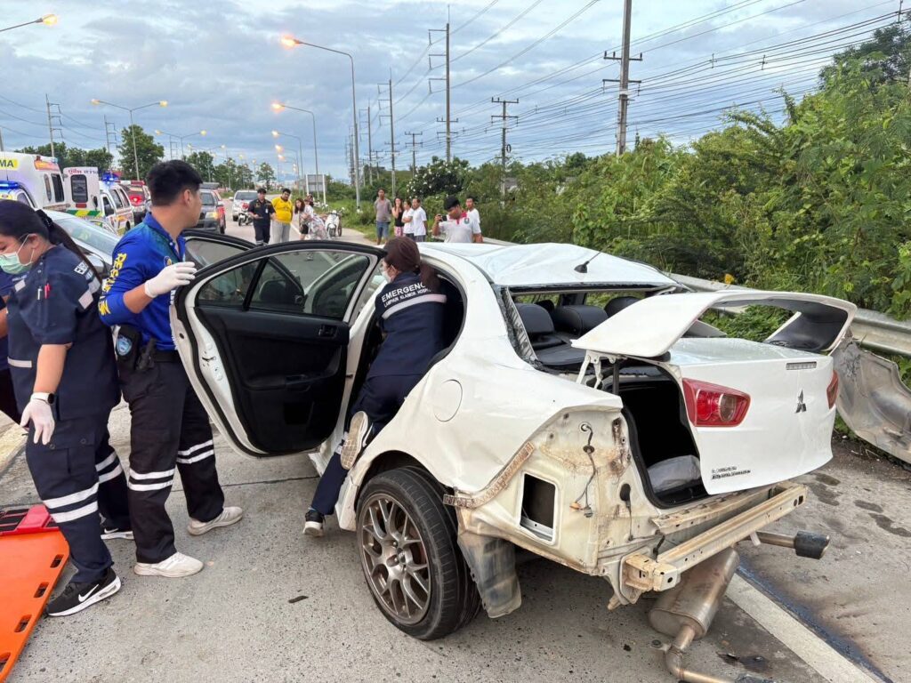 เบื้องต้นผู้บาดเจ็บรู้สึกตัวดี จากการสอบถามผู้เห็นเหตุการณ์พบว่ารถเก๋งปีนเกาะกลางข้ามมาชน ส่วนสาเหตุที่แท้จริงรอการสอบสวนจากทางตำรวจ
