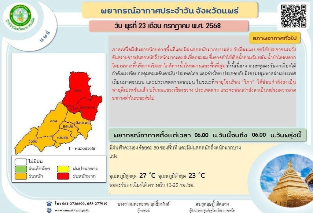 เมื่อเวลา 09.00 น.วันที่ 23 กรกฎาคม 2568 ที่ศูนย์บริหารจัดการน้ำจังหวัดแพร่ ต.ทุ่งโฮ้ง อ.เมืองแพร่ จังหวัดแพร่นายสมชัย เลิศประสิทธพันธ์ ผู้ว่าราชการจังหวัดแพร่ ประชุมวอร์รูมอุทกภัยจังหวัดแพร่ ที่ศูนย์บริหารจัดการน้ำจังหวัดแพร่ฯ เพื่อติดตามสถานการณ์น้ำฝนจากอิทธิพลของ”พายุวิภา” ประเมินสถานการณ์ และมอบหมายสั่งการหน่วยรับผิดชอบดำเนินการ แจ้งเตือน และเข้าช่วยเหลือประชาชนได้อย่างทันท่วงที