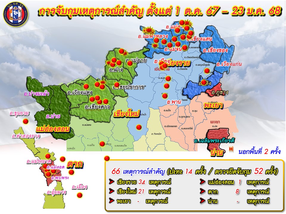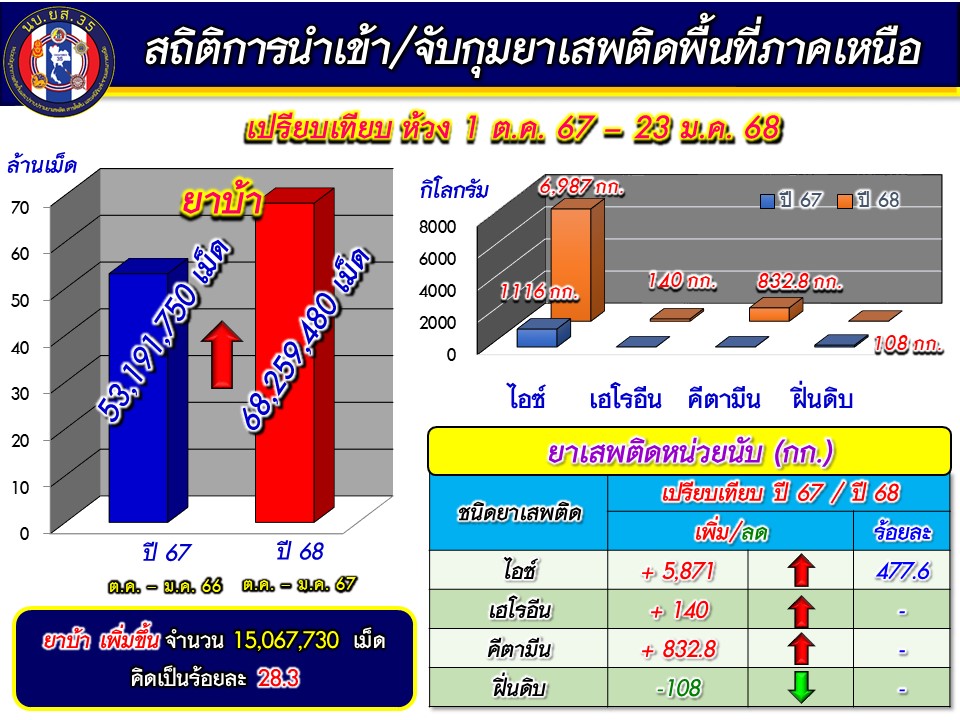 ผลการดำเนินงานตั้งแต่ 1 ต.ค. 67 – 24 ม.ค. 68 มีเหตุการณ์ 66 เหตุการณ์ (ปะทะ 14 ครั้ง ตรวจยึด/จับกุม 52 ครั้ง) จับกุมยาบ้า 68.25 ล้านเม็ดเศษ, ไอซ์ 6,447 กก., เฮโรอีน 140 กก., เคตามีน 832 กก. Happy Water 4.8 กก. เคมีภัณฑ์ 880 ตัน ผู้ต้องหา 66 คน เสียชีวิต 4 ศพ