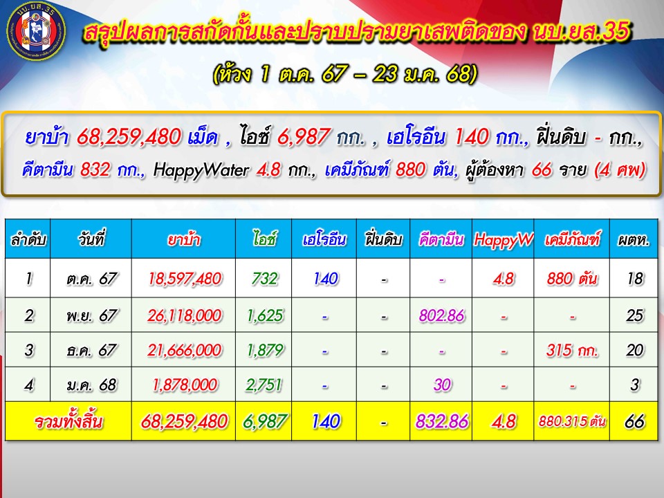 ผลการดำเนินงานตั้งแต่ 1 ต.ค. 67 – 24 ม.ค. 68 มีเหตุการณ์ 66 เหตุการณ์ (ปะทะ 14 ครั้ง ตรวจยึด/จับกุม 52 ครั้ง) จับกุมยาบ้า 68.25 ล้านเม็ดเศษ, ไอซ์ 6,447 กก., เฮโรอีน 140 กก., เคตามีน 832 กก. Happy Water 4.8 กก. เคมีภัณฑ์ 880 ตัน ผู้ต้องหา 66 คน เสียชีวิต 4 ศพ