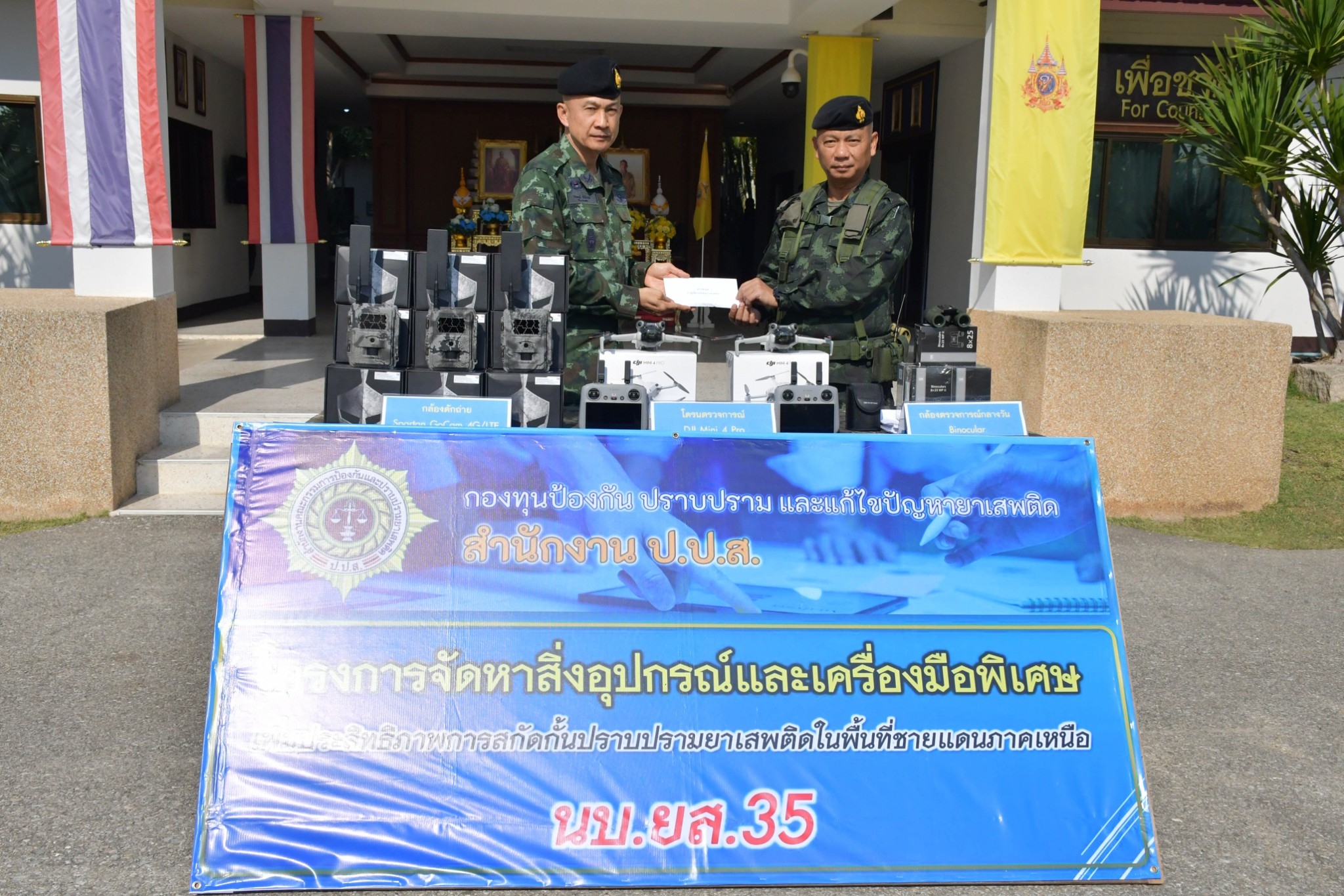 พร้อมกันนี้ ผบ.นบ.ยส.35 ได้มอบสิ่งอุปกรณ์ และเครื่องมือพิเศษ เพื่อเพิ่มประสิทธิภาพในการสกัดกั้น และปราบปรามยาเสพติด ในพื้นที่ชายแดนภาคเหนือ ซึ่งได้รับการสนับสนุนงบประมาณจาก สำนักงานบังคับคดีและบริหารงานกองทุน สำนักงาน ปปส. ให้กับหน่วยในพื้นที่ เพื่อเป็นขวัญและกำลังใจให้กับกำลังพลที่ปฏิบัติงาน