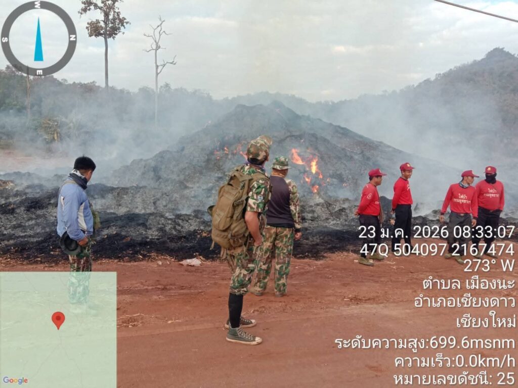 วันที่ 23 มกราคม 2569 เวลา 07.30 น. ศูนย์บัญชาการป้องกันและแก้ไขปัญหาฝุ่นละอองขนาดเล็ก (PM2.5) อำเภอเชียงดาว ได้รับรายงานจากอุทยานแห่งชาติผาแดง ว่า ได้ตรวจพบจุดความร้อน (Hotspot) จากดาวเทียม Suomi NPP (ระบบ VIIRS) ในพื้นที่ป่าอนุรักษ์อุทยานแห่งชาติผาแดง จำนวน 1 จุด บริเวณพิกัด 47Q 503781 2167468 บ้านป่าบงงาม ตำบลเมืองนะ อ.เชียงดาว จ.เชียงใหม่