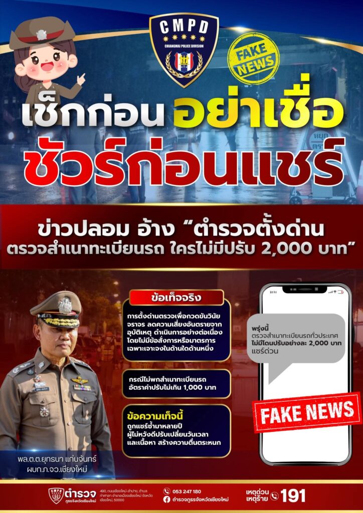 ข่าวปลอม‼️ “ตำรวจตั้งด่านตรวจสำเนาทะเบียนรถ ใครไม่มีปรับ 2,000 บาท” ตำรวจภูธรจังหวัดเชียงใหม่ ขอความร่วมมือประชาชนอย่าเชื่อ อย่าแชร์