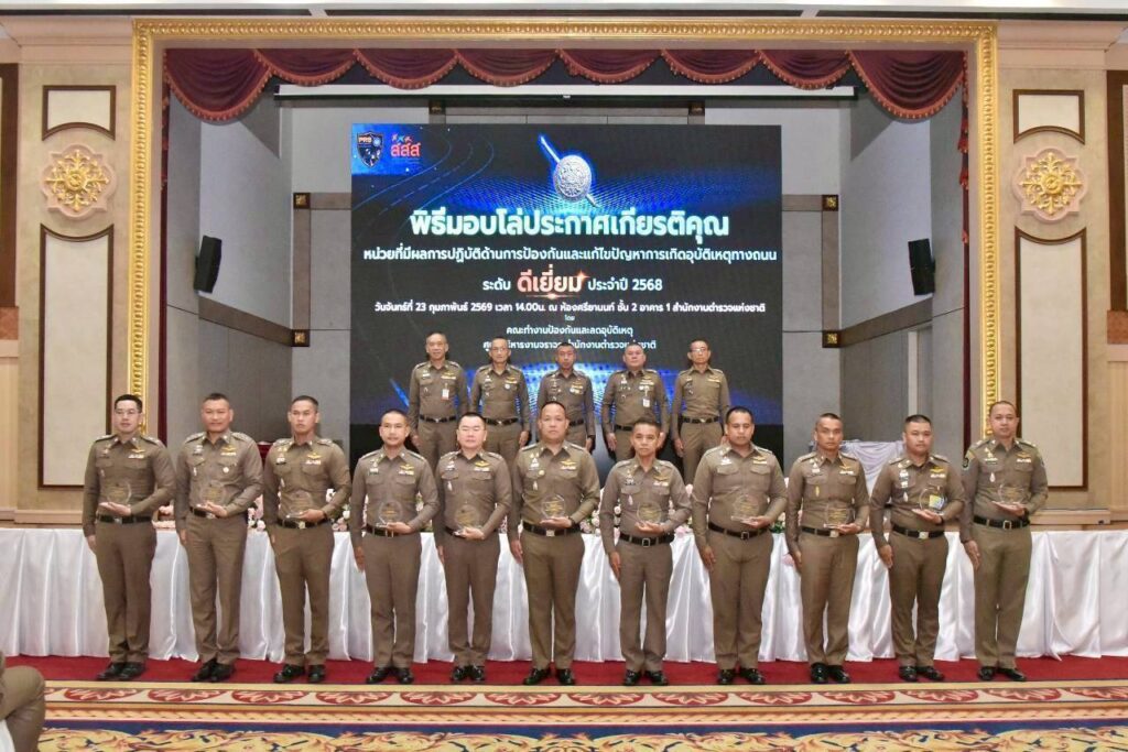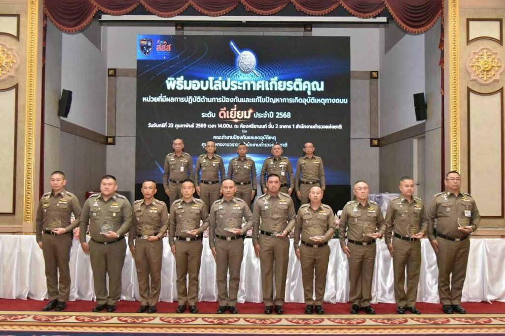 วันนี้ (24 กุมภาพันธ์ 2569) พล.ต.อ.สำราญ นวลมา รองผู้บัญชาการตำรวจแห่งชาติ ในฐานะผู้อำนวยการศูนย์บริหารงานจราจร สำนักงานตำรวจแห่งชาติ เปิดเผยว่า วานนี้ พล.ต.อ.กิตติ์รัฐ พันธุ์เพ็ชร์ ผู้บัญชาการตำรวจแห่งชาติ (ผบ.ตร.) มอบหมายให้เป็นประธานในพิธีมอบโล่ประกาศเกียรติคุณให้แก่หน่วยที่มีผลการปฏิบัติด้านการป้องกันและแก้ไขปัญหาการเกิดอุบัติเหตุทางถนน ระดับดีเยี่ยม ประจำปี 2568 และประธานการประชุมบริหารงานจราจร และ ศูนย์บริหารงานจราจร สำนักงานตำรวจแห่งชาติ ครั้งที่ 2/2569 โดยมีคณะทำงานศูนย์บริหารงานจราจร สำนักงานตำรวจแห่งชาติ และผู้แทนหน่วยต่าง ๆ ที่เกี่ยวข้อง ร่วมประชุม ณ ห้องศรียานนท์ ชั้น 2 อาคาร 1 สำนักงานตำรวจแห่งชาติ และการประชุมทางไกลผ่านจอภาพ (VDO Conference)