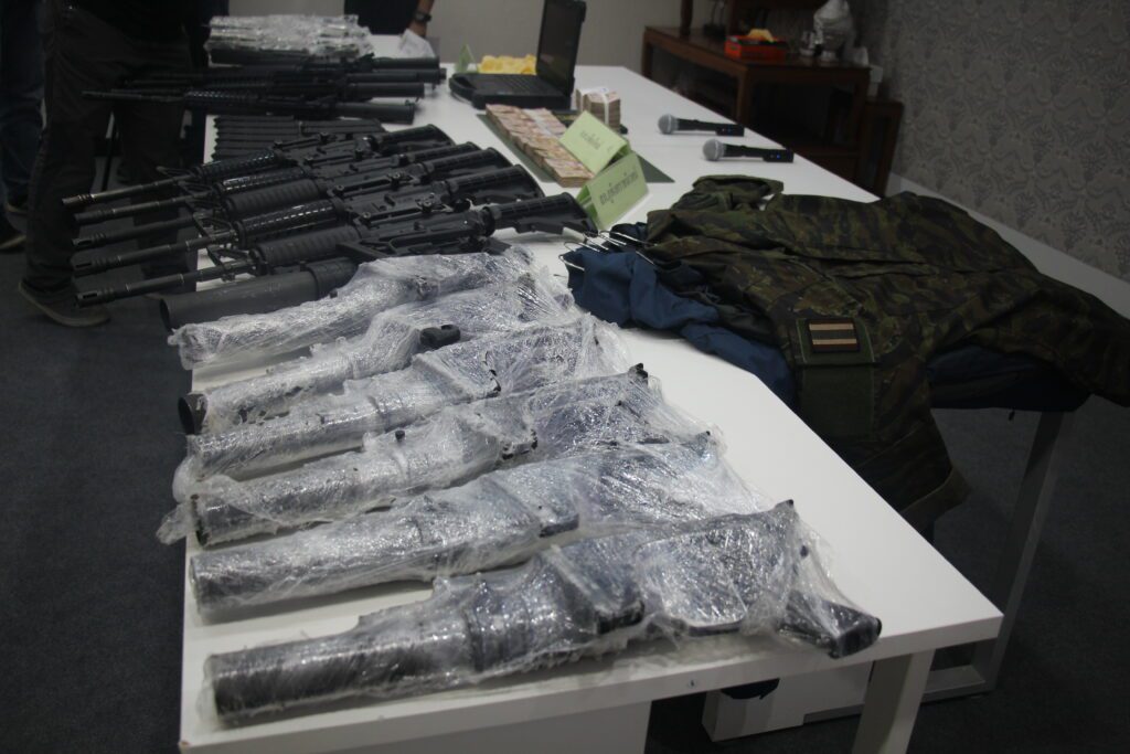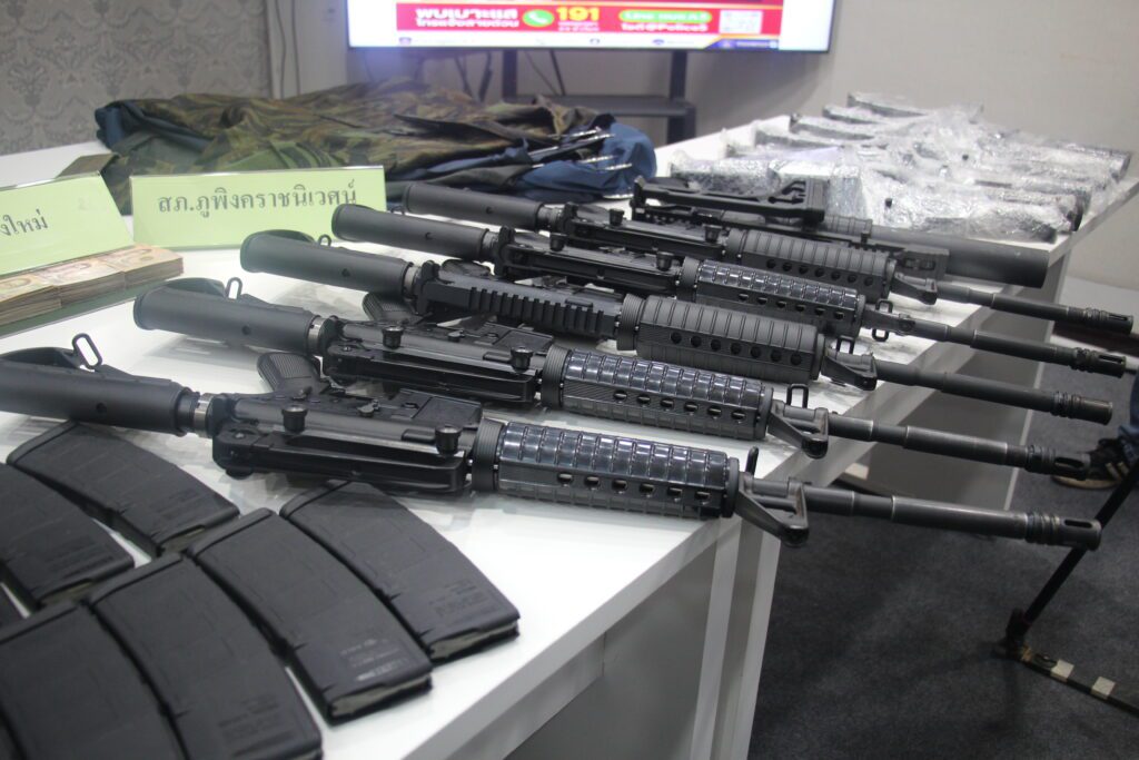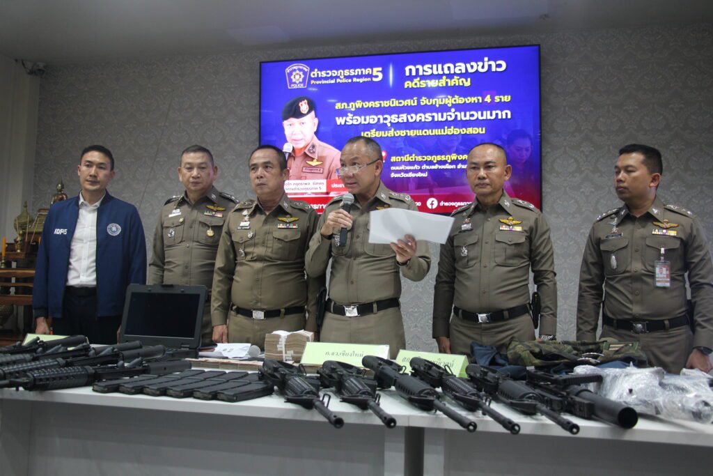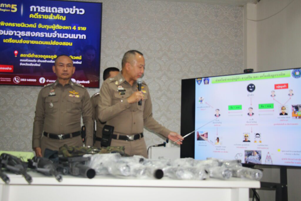 เมื่อวันที่ 24 เมษายน 2568 เวลา 10.30 น. ที่ห้องประชุมชั้น 3 สภ.ภูพิงค์ราชนิเวศน์ อ.เมือง จ.เชียงใหม่ พล.ต.ท.กฤตธาพล ยี่สาคร ผบช.ภ.5 พล.ต.ต.ธวัชชัย พงษ์วิวัฒนชัย รองผบช.ภ.5 พล.ต.ต.ยุทธนา แก่นจันทร์ ผบก.ภ.จว.เชียงใหม่ ร่วมกันแถลงข่าว การจับกุมแก๊งค์ค้าอาวุธสงคราม ส่งออกไปยังต่างประเทศ โดยทางเจ้าหน้าที่ตำรวจสามารถจับกุมตัว นายไกรเพชร (ขอสงวนนามสกุล) อายุ 28 ปี ภูมิลำเนา จว.แม่ฮ่องสอน นายกีรติภพ (ขอสงวนนามสกุล) อายุ 27 ปี ภูมิลำเนา จว.แม่ฮ่องสอน นายสมศักดิ์ (ขอสงวนนามสกุล) อายุ 31 ปีภูมิลำเนา จว.เชียงใหม่ นายเตชพล (ขอสงวนนามสกุล) อายุ 35 ปี ภูมิลำเนา ชาวกรุงเทพฯ พร้อมของกลางอาวุธปืนเล็กยาว ทรง AR ขนาด 5.56 มม. จำนวน 10 กระบอก ซองกระสุนปืนขนาด 5.56 มม. จำนวน 10 ซอง เครื่องยิงลูกระเบิด ขนาด 40 มม.จำนวน 14 กระบอก อาวุธปืนพกสั้น 1 กระบอก เงินสด 2 ล้านบาท เสื้อเกราะกันกระสุน 1 เครื่อง วิทยุสื่อสาร 1 เครื่อง คอมพิวเตอร์ 1 เครื่อง จึงนำตัวผู้ต้องหาทั้งหมดมาดำเนินคดีข้อหา”ร่วมกันมียุทธภัณฑ์(อาวุธปืนและเครื่องยิงลูกระเบิด) โดยไม่ได้รับอนุญาต ร่วมกันมีอาวุธปืนที่นายทะเบียนไม่อาจออกใบอนุญาตให้ได้ ร่วมกันพกพาอาวุธปืนติดตัวไปในเมือง หมู่บ้าน หรือทางสาธารณะโดยไม่ได้รับอนุญาต และโดยไม่มีเหตุจำเป็นเร่งด่วน ร่วมกันค้า หรือจำหน่ายอาวุธปืนฯ นอกจากที่กำหนดในกฎกระทรวงที่ออกตามมาตรา 55″