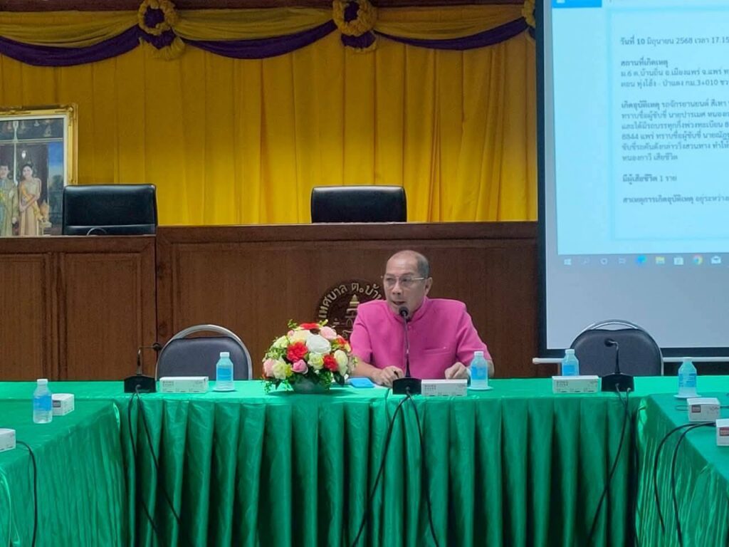 เมื่อเวลา 09.30 น.วันที่ 24 มิถุนายน 2568 ณ ห้องประชุมเทศบาลตำบลบ้านถิ่น อำเภอเมืองแพร่ จังหวัดแพร่ ทาง พ.ต.ท.ธงชัย เนื่องพืช นายก เทศมนตรีตำบลบ้านถิ่น กล่าวต้อนรับคณะฯ โดยมีผู้บริหาร เข้าร่วม นายอารุณ ปินตา หัวหน้าสำนักงานป้องกันและบรรเทาสาธารณภัยจังหวัดแพร่ มอบหมายให้นางสาวรำพู จันต๊ะปะตุ หัวหน้ากลุ่มงานยุทธศาสตร์และการจัดการ ร่วมกับคณะทำงานวิเคราะห์สาเหตุการเกิดอุบัติเหตุทางถนนจังหวัดแพร่ คณะกรรมการ ศปถ.อ.เมืองแพร่ ศปถ.ทต.บ้านถิ่น และหน่วยงานที่เกี่ยวข้องในพื้นที่ ลงพื้นที่ เพื่อสืบค้นหาสาเหตุการเกิดอุบัติเหตุ กรณีรถบรรทุกเทรลเลอร์ชนกับรถจักรยานยนต์ ในพื้นที่ตำบลบ้านถิ่น อำเภอเมืองแพร่ จังหวัดแพร่ รถบรรทุกเทรลเลอร์สีขาว หัวลาก หมายเลขทะเบียน 81-8789 แพร่ และลากจูง 81-8844 แพร่ จอดริมทางด้านช้ายมือ โดยมีนายณัฏฐากร ทิวงศ์ษา อายุ 29 ปี เป็นผู้ขับขี่ ชนกับรถจักรยาน