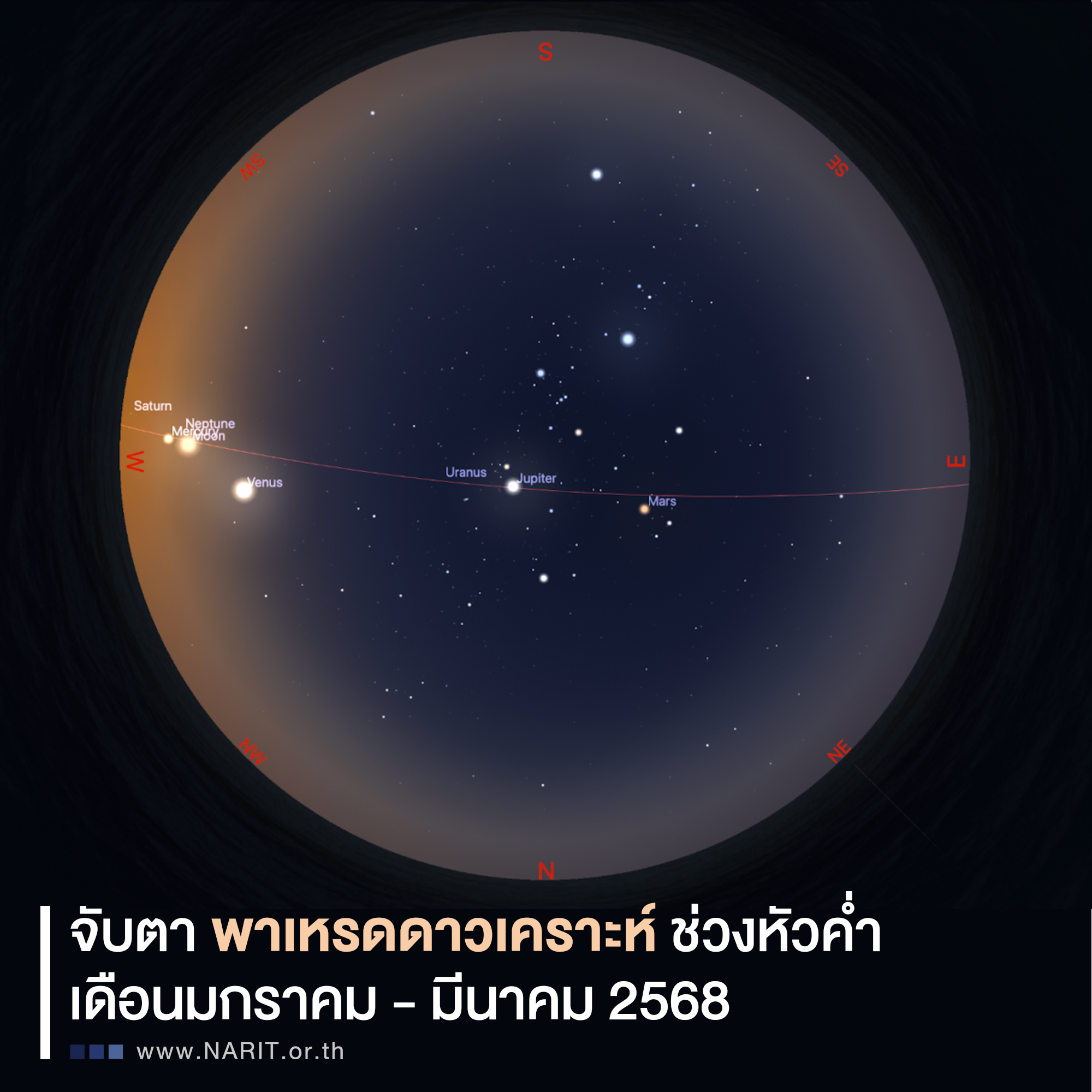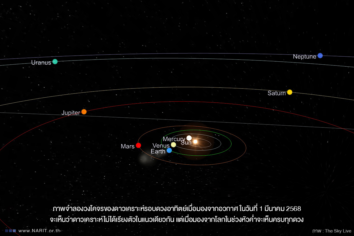 สถาบันวิจัยดาราศาสตร์แห่งชาติ (องค์การมหาชน) (สดร. หรือ NARIT) กระทรวงการอุดมศึกษา วิทยาศาสตร์ วิจัย และนวัตกรรม (อว.) ชวนจับตา “พาเหรดดาวเคราะห์” หรือ “ดาวเคราะห์เรียงตัว” ช่วงเดือน ม.ค. – มี.ค. 68 ดวงจันทร์ และดาวเคราะห์ในระบบสุริยะจะปรากฏเรียงกันบนท้องฟ้าช่วงหัวค่ำ ได้แก่ ดาวเสาร์ ดาวพุธ ดาวศุกร์ ดาวพฤหัสบดี และดาวอังคาร สังเกตได้ด้วยตาเปล่า รวมถึง ดาวเนปจูน ดาวยูเรนัส สังเกตเห็นได้หากมองผ่านกล้องโทรทรรศน์ ทั้งนี้ ดาวเคราะห์ไม่ได้โคจรเรียงตามกันแต่อย่างใด เป็นเพียงความสวยงามของปรากฏการณ์ท้องฟ้ายามค่ำคืนในมุมมองจากโลก และเกิดขึ้นไม่บ่อยครั้งนัก