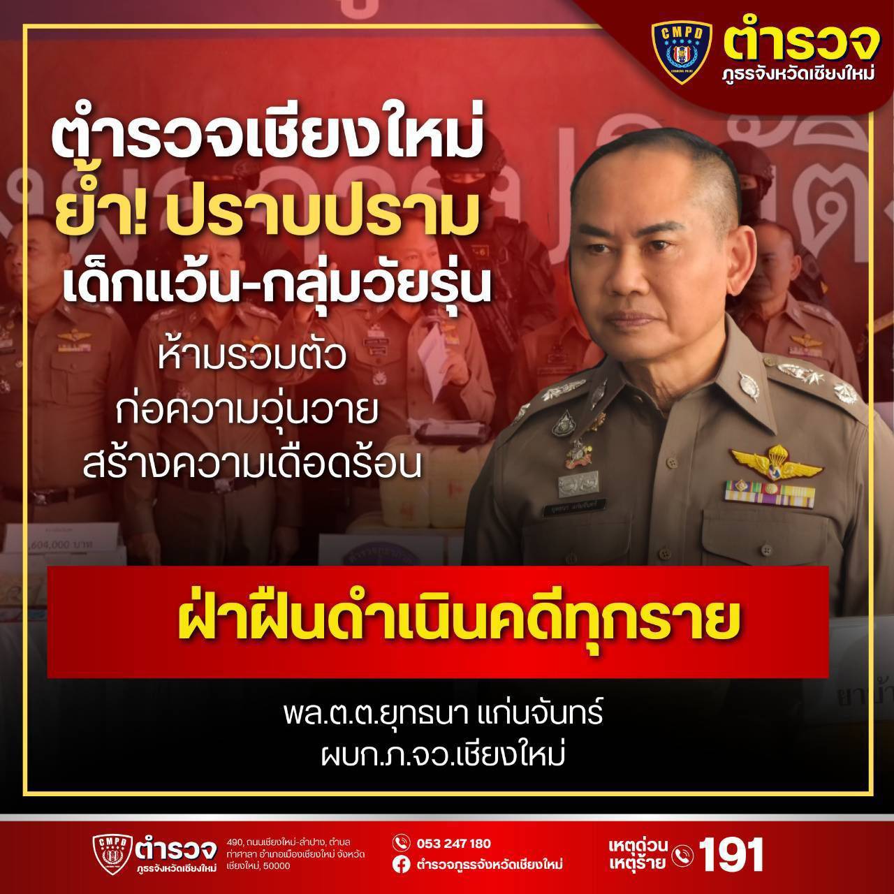 เชียงใหม่-ผู้บังคับการตำรวจภูธรจังหวัดเชียงใหม่คุ้มเข้มกลุ่มวัยรุ่นป่วนเมือง เพื่อสร้างความสงบสุขให้กับชาวเชียงใหม่และนักท่องเที่ยว