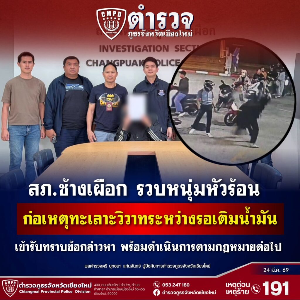 จากกรณีข่าวในสื่อโซเชียล กรณีที่มีการแย่งคิวเพื่อเติมน้ำมัน จนก่อให้เกิดเหตุทะเลาะวิวาท เป็นเหตุให้มีผู้เสียหายเมื่อคืนที่ผ่านมา ภายใต้การอำนวยการของ พล.ต.ต.ยุทธนา แก่นจันทร์ ผบก.ภ.จว.เชียงใหม่ มอบหมายให้ พ.ต.อ.เสวก ชูศิริ ผกก.สภ.ช้างเผือก และ จนท.ชุดสืบสวน สภ.ช้างเผือก ได้สืบสวนติดตามผู้ก่อเหตุทำร้ายร่างกายและทำให้เสียทรัพย์ วันอังคารที่ 24 มีนาคม 2569 เวลา 14.00 น. จนท.ชุดสืบสวนฯ ได้ตรวจสอบกล้องวงจรวงปิดในบริเวณปั๊มน้ำมันที่เกิดเหตุ จนสามารถติดตามตัวผู้ก่อเหตุฯได้ เบื้องต้นเป็นหนุ่มวัย 31 ปี จนท.ชุดสืบสวนจึงได้ลงพื้นที่ไปตรวจสอบบริเวณบ้านพักของชายหนุ่มคนดังกล่าว เบื้องต้นรับว่าเป็นคู่กรณีที่ได้ก่อเหตุทะเลาะวิวาทกับผู้แจ้งจริง จึงได้เชิญตัวมาพบพนักงานสอบสวน ที่ สภ.ช้างเผือก เพื่อดำเนินการในส่วนที่เกี่ยวข้องต่อไป