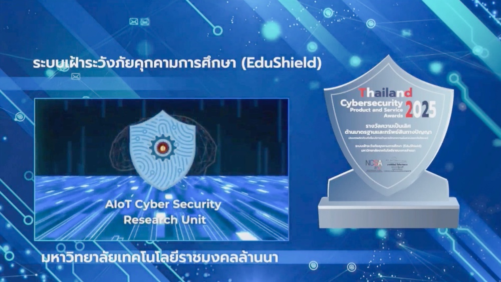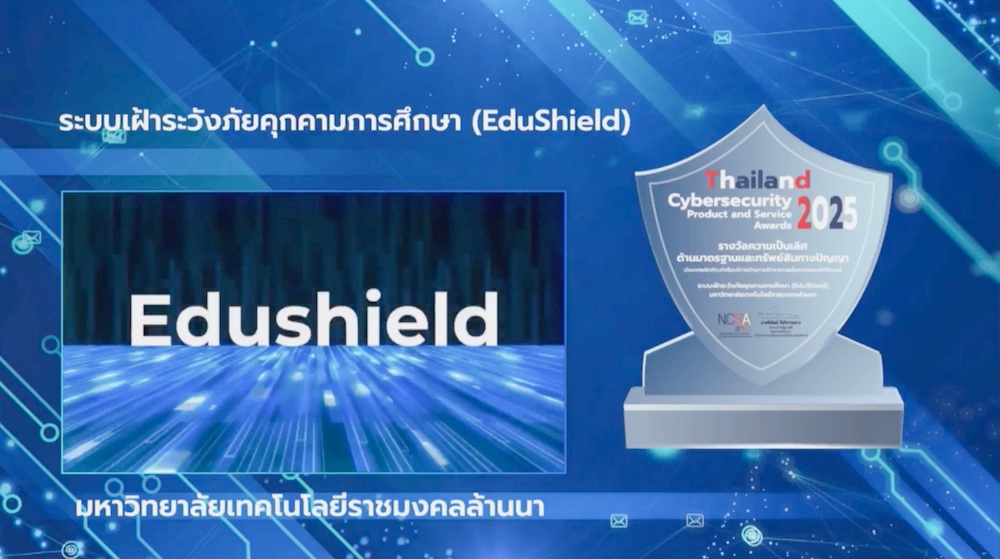 มทร.ล้านนา ได้รับรางวัลภายใต้นวัตกรรม “EduShield” (https://edushield.rmutl.ac.th/) ระบบเฝ้าระวังภัยคุกคามการศึกษา เป็นผลงานที่ได้รับการรับรองตามมาตรฐานสากล หรือมีการจดทะเบียนสิทธิบัตร/ลิขสิทธิ์ แสดงถึงศักยภาพและคุณภาพของนวัตกรรมไทยในระดับนานาชาติ ซึ่งสำนักงานคณะกรรมการการรักษาความมั่นคงปลอดภัยไซเบอร์แห่งชาติ (สกมช.) ได้จัดพิธีมอบรางวัลอันทรงเกียรติ เพื่อเชิดชูองค์กรที่มีผลงานโดดเด่นด้านความมั่นคงปลอดภัยทางไซเบอร์ จากพลตรีวีรวุฒิ วิทยากรณ์ รองเลขาธิการฯ กล่าวรายงาน ได้รับเกียรติจากนายอารี ไกรนรา ผู้ช่วยรัฐมนตรีประจำสำนักนายกรัฐมนตรี กล่าวปาฐกถาเปิดงาน ท่ามกลางตัวแทนจากหน่วยงานรัฐ หน่วยงานโครงสร้างพื้นฐานสำคัญทางสารสนเทศ (CII) บริษัทเอกชน และศูนย์ประสานการรักษาความมั่นคงปลอดภัย (CERT) ที่เข้าร่วมงานกันอย่างคับคั่ง