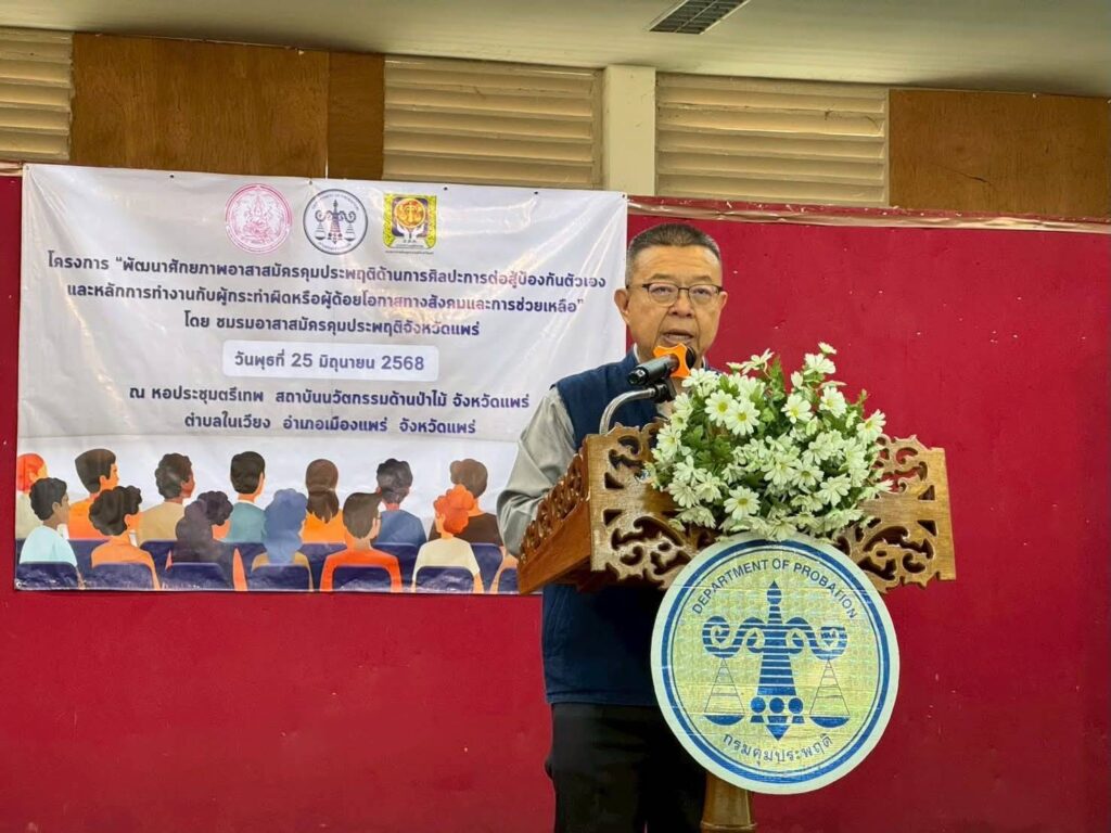 เมื่อวันที่ 25 มิถุนายน 2568 ณ.หอประชุมตรีเทพ สถาบันนวัตกรรมด้านป่าไม้จังหวัดแพร่ ตำบลในเวียง อำเภอเมืองแพร่ จังหวัดแพร่ นายชัยสิทธิ์ ชัยสัมฤทธิ์ผล รองผู้ว่าราชการจังหวัดแพร่ ประธานในพิธีฯ มี นายสมมี สุรินทร์รัฐ ประธานชมรมอาสาสมัครคุมประพฤติจังหวัดแพร่ นายโชคชัย บุญชูช่วย ผู้อำนวยการสำนักงานคุมประพฤติจังหวัดแพร่ พร้อมด้วยเจ้าหน้าที่สำนักงานคุมประพฤติจังหวัดแพร่ หัวหน้าส่วนราชการ เข้าร่วมพิธีเปิด