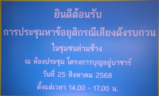 เมื่อวันที่ 25 สิงหาคม 2568 เวลา 14.00 น.ได้มีการประชุมกรณีร้านอาหารเปิดเพลงเสียงดังเสียงในชุมชน โดยมีหลายหน่วยงานเข้าร่วมรวมทั้ง ประธานชุมชน วัดเชียงมั่น วัดล่ามช้าง วัดป้านปิง และผู้ที่อาศัยอยู่ในชุมชนต่าง ๆ เพื่อหาข้อสรุปหาข้อยุติกรณีเสียงดังรบกวนในชุมชนล่ามช้าง ณ โครงการบุญอยู่บาซาร์ ถ.ราชวิธี ต.ศรีภูมิ อ.เมือง จ.เชียงใหม่