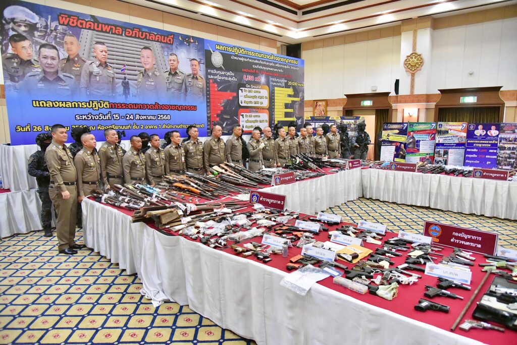 วันนี้ (26 สิงหาคม 2568) เวลา 11.00 น. พล.ต.อ.ธนายุตม์ วุฒิจรัสธำรงค์ ที่ปรึกษาพิเศษสำนักงานตำรวจแห่งชาติ แถลงผลการดำเนินการระดมกวาดล้างอาชญากรรม เป้าหมายผู้กระทำความผิดเกี่ยวกับอาวุธปืน และเครื่องกระสุนปืน และสืบสวนจับกุมบุคคลตามหมายจับ ระหว่างวันที่ 15 – 24 สิงหาคม 2568 ภายใต้แผนยุทธการ “พิชิตคนพาล อภิบาลคนดี” ณ ห้องศรียานนท์ อาคาร 1 สำนักงานตำรวจแห่งชาติ
