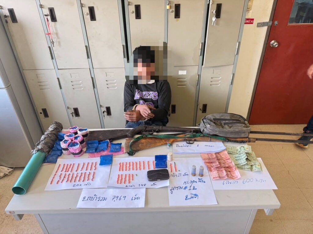 นอกจากนี้ การตรวจค้นภายในกระท่อมยังพบอาวุธปืนและเครื่องกระสุนปืนประกอบด้วย กระสุนปืนขนาดเบอร์ 12 จำนวน 2 นัด และ อาวุธปืนแก๊ปยาวไทยประดิษฐ์ จำนวน 2 กระบอก