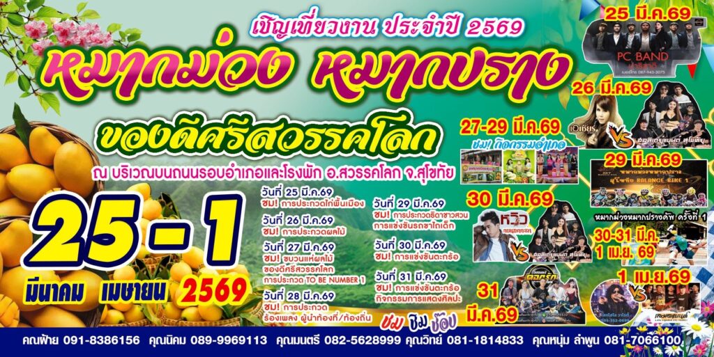 พร้อมการแสดงบนเวทีกลางจากเยาวชนTO BE NUMBER ONE การแสดงคอนเสริด์จากเหล่าศิลปิน นักร้องจากค่ายเพลงดัว ทั้งนี้ยังมีการประกวดผลไม้อาทิเช่น มะปราค์ มะยงชิด ละมุด มะม่วง จากเกษตรกรในพื้นที่ การประกวดธิดาชาวสวน.การประกวด ไก่พื้นบ้าน การประกวดการร้องเพลงจากผู้นำทั้งท้องที่และท้องถิ่น การแข่งขันจักรยานหนูน้อยขาไถ .การแข่งขันแข่งขันตะกร้อ ฯลฯ โดยมีการกิจกรรมมากมายในทุกค่ำคืน จึงขอเชิญชวนนักท่องเที่ยว มาเที่ยวชมงาน ประจำปี หมากม่วง หมากปราง ของดีศรีสวรรคโลกโดยงานเริ่มตั้งแต่วันที่25มีนาคมถึง1เมษายน2569เป็.นต้นไป