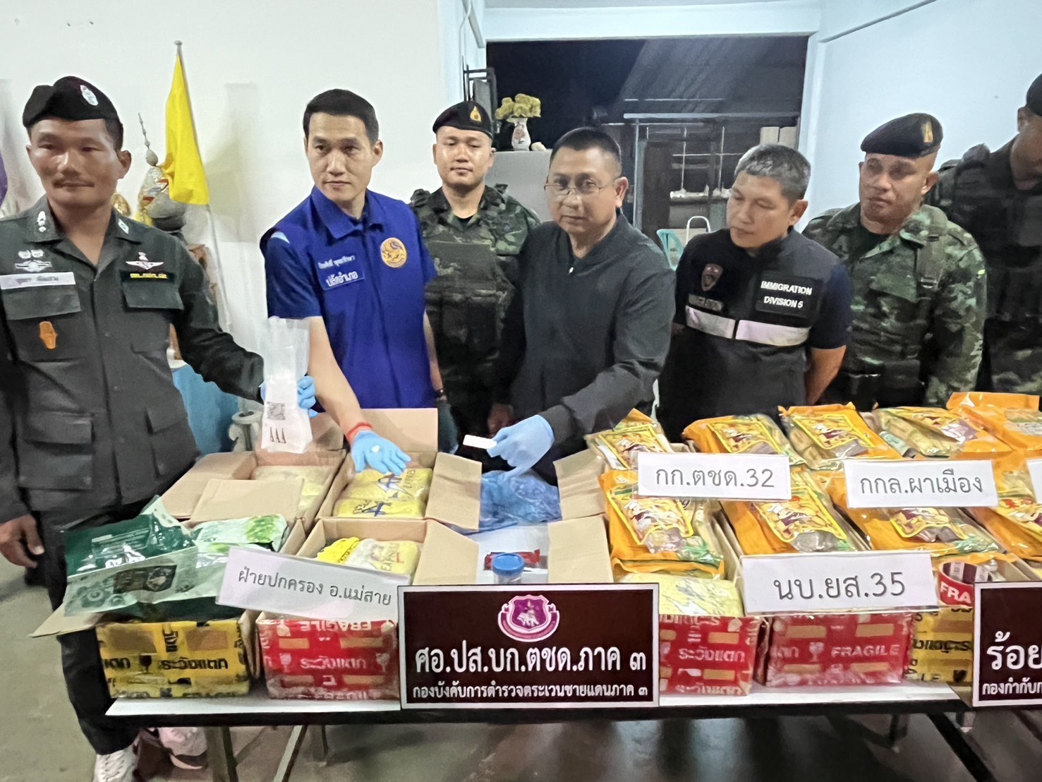 จากกรณี เมื่อ 25 มี.ค. 68 เวลา 12.00 น. ร้อย.ตชด.327 ฉก.ตชด.32 ได้รับแจ้งจากแหล่งข่าวว่า จะมีการลักลอบลำเลียงยาเสพติดผ่านบริษัทขนส่งสินค้าโลจิสติกส์ ในพื้นที่ อ.แม่สาย จว.ช.ร. เพื่อส่งต่อไปยังพื้นที่ตอนใน ต่อมาเมื่อ 26 มี.ค. 68 เวลา 14.00 น. ร้อย.ตชด.327 ฉก.ตชด.32 ได้จัด กำลัง 1 ชป. ทำการบังคับใช้กฎหมายต่อผู้กระทำผิดตาม พ.ร.บ. ประมวลกฎหมายยาเสพติด บริเวณ บริษัท Flash Home Express สาขาแม่สาย หมู่ 13 ต.แม่สาย อ.แม่สาย จว.ช.ร. ระหว่างการเข้าทำการตรวจสอบบริเวณพื้นที่ดังกล่าว ได้ตรวจพบบุคคลต้องสงสัย จำนวน 2 ราย (ช.) ได้นำกล่องพัสดุ จำนวน 4 กล่อง เข้ามาส่งที่บริษัท หน่วยจึงได้แสดงตัวเพื่อขอทำการตรวจค้น ผลการตรวจค้น พบยาเสพติดให้โทษประเภท 2 (วัตถุออกฤทธิ์ต่อจิตและประสาทประเภท 2 (คีตามีน)) ซุกซ่อนอยู่ในกล่องพัสดุดังกล่าว รวมน้ำหนักประมาณ 16 กก. ทราบชื่อผู้ส่ง นาย ชนินทร์ (ขอสงวนนามสกุล) และ นาย วัชรพงษ์ (ขอสงวนนามสกุล)