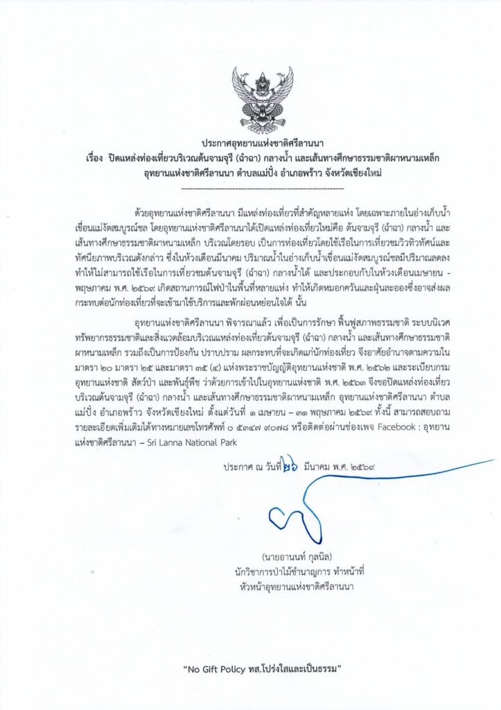 เชียงใหม่-ประกาศปิดแหล่งท่องเที่ยว ” ต้นฉำฉากลางน้ำ และเส้นทางศึกษาธรรมชาติผาหนามเหล็ก อุทยานแห่งชาติศรีลานนา “