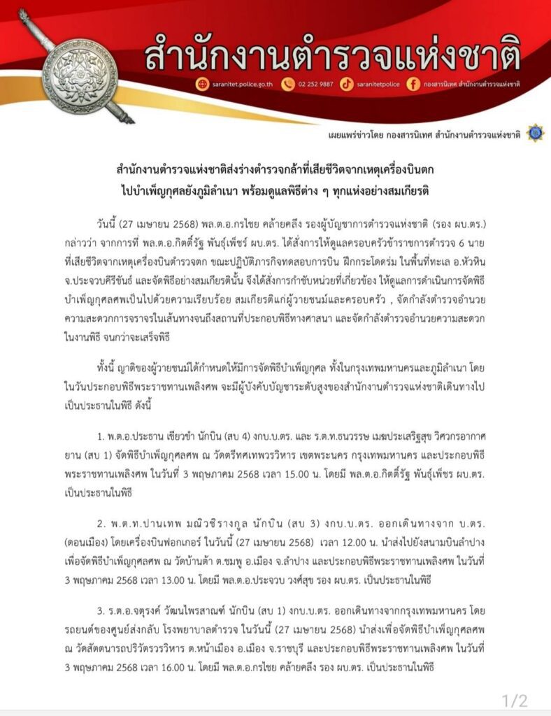 วันนี้ (27 เมษายน 2568) พล.ต.อ.กรไชย คล้ายคลึง รองผู้บัญชาการตำรวจแห่งชาติ (รอง ผบ.ตร.) กล่าวว่า จากการที่ พล.ต.อ.กิตติ์รัฐ พันธุ์เพ็ชร์ ผบ.ตร. ได้สั่งการให้ดูแลครอบครัวข้าราชการตำรวจ 6 นาย ที่เสียชีวิตจากเหตุเครื่องบินตำรวจตก ขณะปฏิบัติภารกิจทดสอบการบิน ฝึกกระโดดร่ม ในพื้นที่ทะเล อ.หัวหิน จ.ประจวบคีรีขันธ์ และจัดพิธีอย่างสมเกียรตินั้น จึงได้สั่งการกำชับหน่วยที่เกี่ยวข้อง ให้ดูแลการดำเนินการจัดพิธีบำเพ็ญกุศลศพเป็นไปด้วยความเรียบร้อย สมเกียรติแก่ผู้วายชนม์และครอบครัว , จัดกำลังตำรวจอำนวยความสะดวกการจราจรในเส้นทางจนถึงสถานที่ประกอบพิธีทางศาสนา และจัดกำลังตำรวจอำนวยความสะดวกในงานพิธี จนกว่าจะเสร็จพิธี