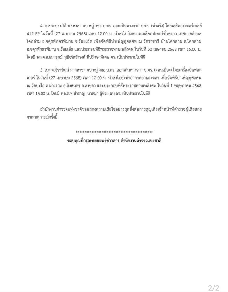 5. ส.ต.ต.จิราวัฒน์ มากสาขา ผบ.หมู่ งชอ.บ.ตร. ออกเดินทางจาก บ.ตร. (ดอนเมือง) โดยเครื่องบินฟอกเกอร์ ในวันนี้ (27 เมษายน 2568) เวลา 12.00 น. นำส่งไปยังท่าอากาศยานสงขลา เพื่อจัดพิธีบำเพ็ญกุศลศพ ณ วัดปะโอ ต.ม่วงงาม อ.สิงหนคร จ.สงขลา และประกอบพิธีพระราชทานเพลิงศพ ในวันที่ 1 พฤษภาคม 2568 เวลา 15.00 น. โดยมี พล.ต.ท.สำราญ นวลมา ผู้ช่วย ผบ.ตร. เป็นประธานในพิธี