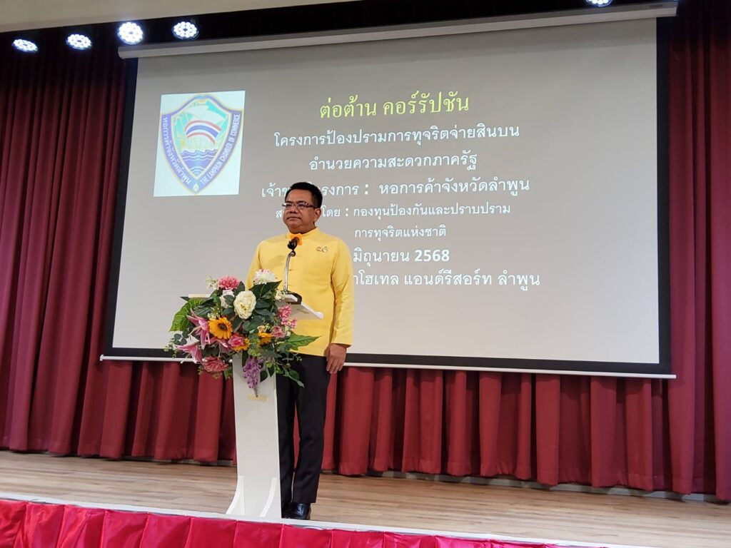 นายโยธิน ประสงค์ความดี รองผู้ว่าราชการจังหวัดลำพูน เป็นประธานเปิดงานการสัมมนา “โครงการป้องปรามการทุจริตการจ่ายสินบนอำนวยความสะดวกให้หน่วยงานภาครัฐ จังหวัดลำพูน” เมื่อวันที่ 27 มิถุนายน 2568 ที่โรงแรมแกรนด์ปา โฮเทล แอนด์ รีสอร์ท ลำพูน ตำบลเวียงยอง อำเภอเมืองลำพูน จังหวัดลำพูน โดยมีนายนพดา อธิกากัมพู ประธานหอการค้าจังหวัดลำพูน, นายบรรจง วิพรหมชัย กรรมการหอการค้าไทย – ประธานอาวุโสหอการค้าจังหวัดลำพูน, นายมานะ นิมิตรมงคล ประธานองค์กรต่อต้านคอรัปชั่นประเทศไทย, นายคมสัน โพธิ์คง นักวิชาการด้านกฎหมาย, ส่วนราชการ, ผู้แทนองค์กรหน่วยงานภาครัฐ, กรรมการและสมาชิกหอการค้าจังหวัดลำพูน, ผู้ประกอบการ SME, สภาอุตสาหกรรม, สภาอุตสาหกรรมท่องเที่ยว, สมาคมธนาคาร, ภาคประชาชน, เจ้าหน้าที่และหน่วยงานที่เกี่ยวข้อง รวมทั้งสิ้นกว่า 200 คน เข้าร่วมโครงการฯ