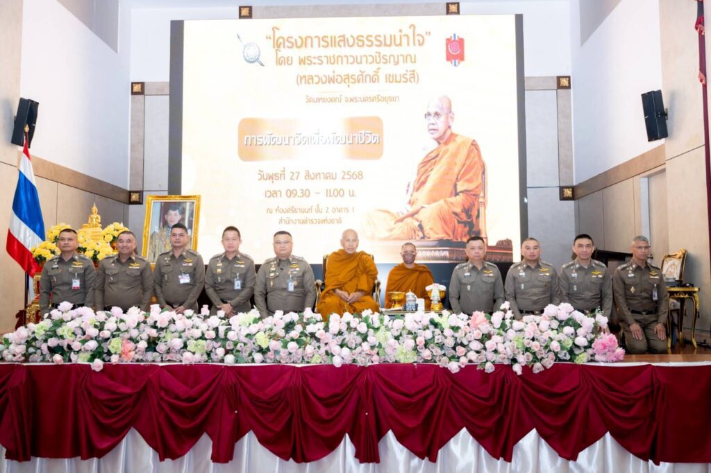วันนี้ (27 สิงหาคม 2568) เวลา 09.30 น. พล.ต.อ.กรไชย คล้ายคลึง รองผู้บัญชาการตำรวจแห่งชาติ เป็นประธานโครงการ “แสงธรรมนำใจ” ครั้งที่ 3 ประจำปีงบประมาณ พ.ศ.2568 โดยมี พล.ต.ท.อิทธิพล อัจฉริยะประดิษฐ์ รองจเรตำรวจแห่งชาติ, คุณอภิรมย์ ทรวดทรง อุปนายกสมาคมแม่บ้านตำรวจ/ที่ปรึกษาโครงการแสงธรรมนำใจ, คุณณพิชชา คล้ายคลึง อุปนายกสมาคมแม่บ้านตำรวจ, คุณดุษฎี เย็นท้วม กรรมการบริหารสมาคมแม่บ้านตำรวจ พร้อมด้วยข้าราชการตำรวจ และคณะแม่บ้านตำรวจ รวมกว่า 300 คน ร่วมฟังการธรรมบรรยายจาก “พระราชภาวนาวชิรญาณ (หลวงพ่อสุรศักดิ์ เขมรํสี)” วัดมเหยงคณ์ จ.พระนครศรีอยุธยา หัวข้อ “การพัฒนาจิตเพื่อพัฒนาชีวิต” ณ ห้องศรียานนท์ ชั้น 2 อาคาร 1 สำนักงานตำรวจแห่งชาติ และทางออนไลน์