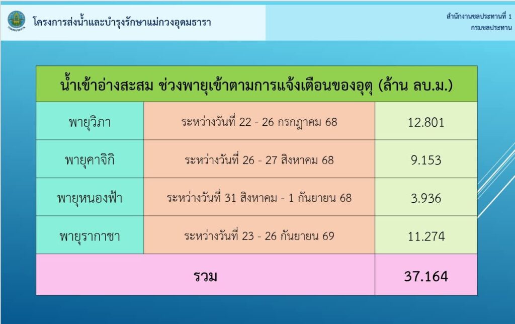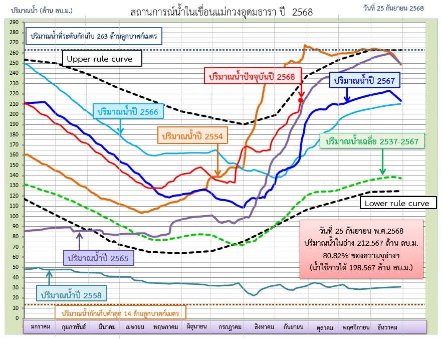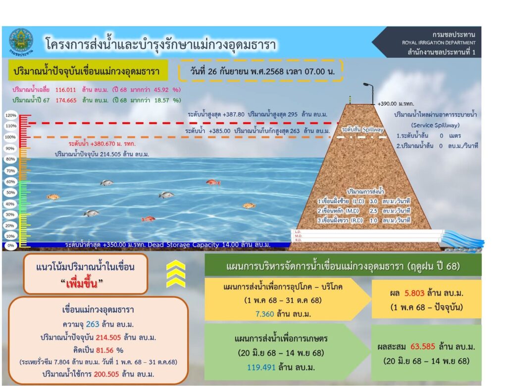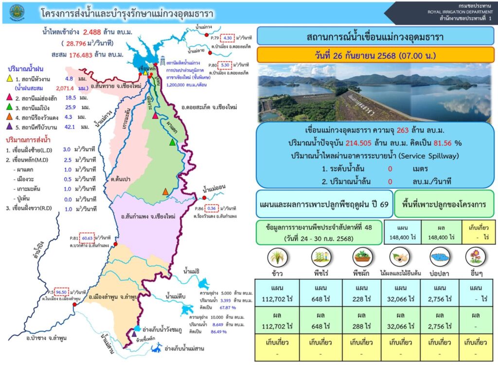 นายเฉลิมเกียรติ อินทกนก ผู้อำนวยการโครงการส่งน้ำและบำรุงรักษาแม่กวงอุดมธารา (ผบค.แม่กวง) เปิดเผยถึงสถานการณ์น้ำของเขื่อนแม่กวงอุดมธารา ว่า ปัจจุบันปริมาณน้ำในเขื่อนแม่กวงฯ มีน้ำราว 214 ล้าน ลบ.ม. คิดเป็น 81.5% ซึ่งปริมาณน้ำที่เข้าอ่างสะสมตั้งแต่เริ่มฤดูฝน(มิ.ย.-ก.ย.)ราว 142 ล้าน ลบ.ม. ซึ่งได้รับจากพายุที่เข้ามาหลักๆ 4 ลูก ได้แก่ พายุวิภา ระหว่างวันที่ 22-26 ก.ค. 68 มีน้ำเข้าเขื่อนฯ ราว 13 ลบ.ม. พายุที่ 2 พายุคาจิกิ ระหว่าง 26-27 ส.ค. 68 มีน้ำเข้าเขื่อนฯ ราว 9 ล้าน ลบ.ม. ต่อมา พายุหนองฟ้า ระหว่างวันที่ 31 ส.ค. ถึง 1 ก.ย. 68 มีน้ำเข้าเขื่อนฯ ราว 4 ล้าน ลบ.ม. และล่าสุด พายุรากาซา ระหว่างวันที่ 23-26 ก.ย. 68 มีน้ำเข้าเขื่อนแม่กวงฯ ราว 11 ล้าน ลบ.ม.