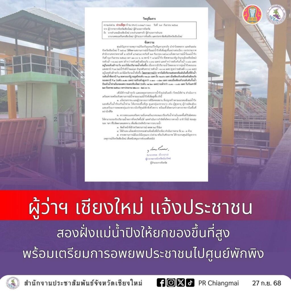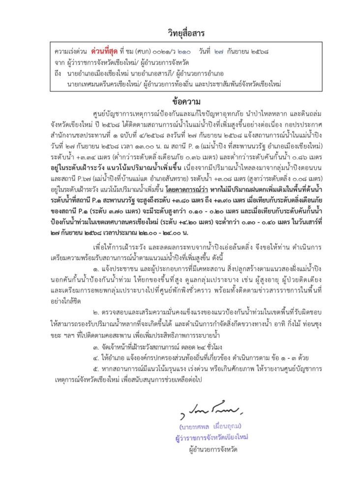 เย็นวันนี้ (27 ก.ย. 68) นายทศพล เผื่อนอุดม ผู้ว่าราชการจังหวัดเชียงใหม่ ออกหยังสือวทยุสื่อสารด่วนไปยังนายอำเภอเมืองเชียงใหม่ นายอำเภอสารภี ผู้อำนวยการอำเภอนายกเทศมนตรีนครเชียงใหม่ ผู้อำนวยการท้องถิ่น เพื่อให้เฝ้าระวังและลดผลกระทบจากน้ำปิงเอ่อล้นตลิ่ง