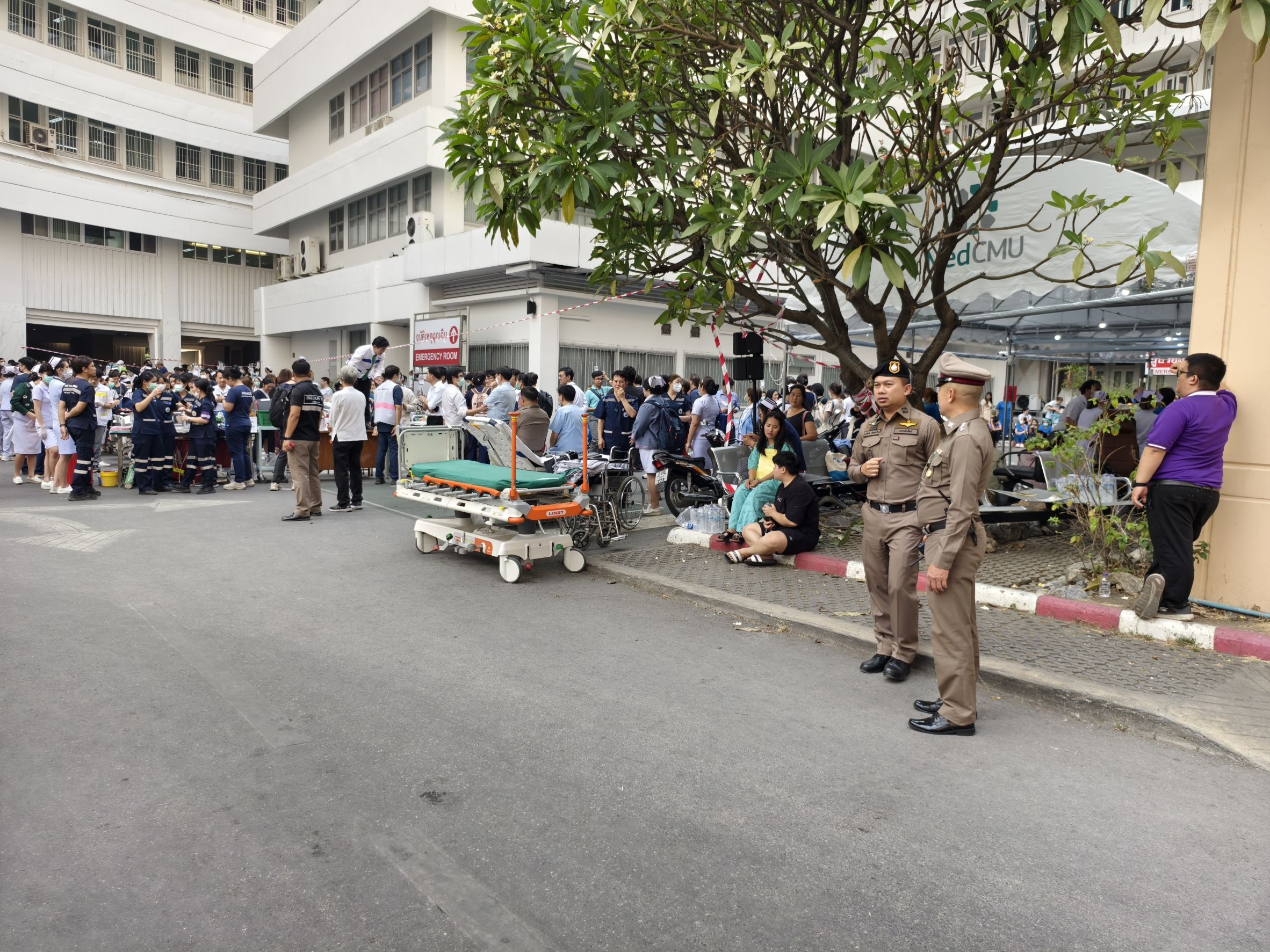 บูรณาการร่วม ฝ่ายปกครอง จนท.แพทย์ รพ.มหาราชนครเชียงใหม่ หน่วยกู้ชีพ กู้ภัย ร่วมอำนวยความสะดวกและดูแลความปลอดภัยให้กับประชาชนผู้มาใช้บริการโรงพยาบาลมหาราชฯ ซึ่งได้มีการเคลื่อนย้ายผู้ป่วยลงมาจากตึกพักรักษาผู้ป่วยเพื่อตรวจสอบโครงสร้างภายในตัวอาคารหลังจากเกิดเหตุการณ์แผ่นดินไหว เมื่อช่วงเวลา 13.22 น. ที่ผ่านมา