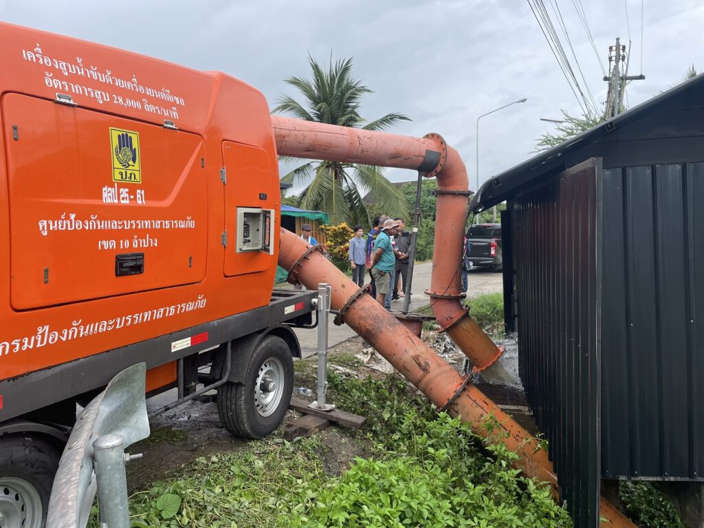 จากการลงพื้นที่ตรวจสอบฯพบว่า บริเวณลำเหมืองใหม่มีการติดตั้งเครื่องสูบน้ำ อัตราการสูบ 28,000 ลิตร/นาที จำนวน 1 เครื่อง จากศูนย์ป้องกันและบรรเทาสาธารณภัย(ศปภ.) เขต 10 ลำปาง กรมป้องกันและบรรเทาสาธารณภัย(ปภ.) กระทรวงมหาดไทย(มท.) โดยได้รับการสนับสนุนจาก สำนักงานป้องกันและบรรเทาสาธารณภัยจังหวัด(สนง.ปภ.จ.)ลำพูน