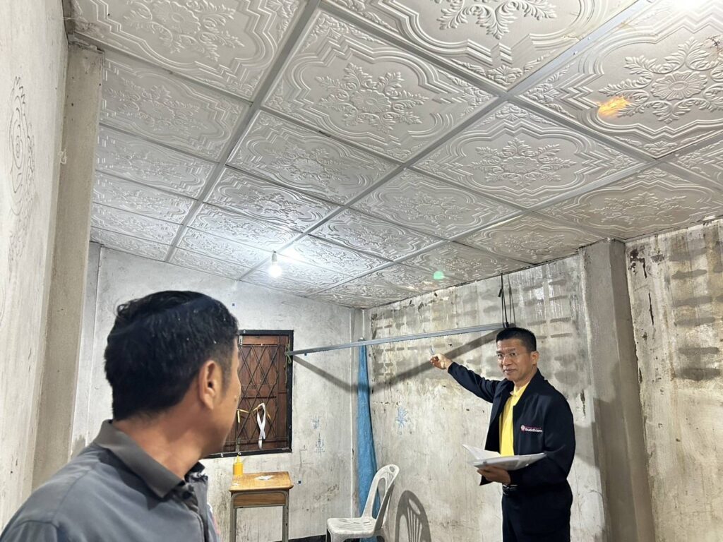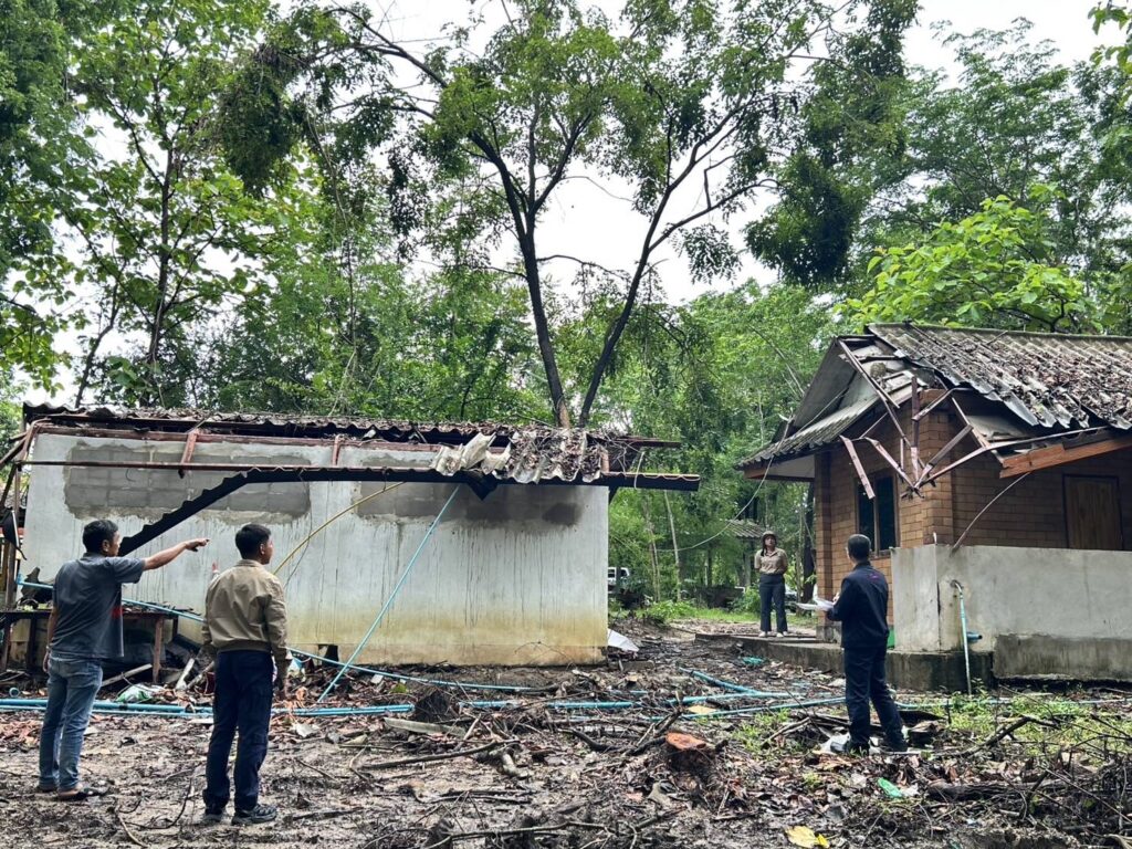 เจ้าหน้าที่ร่วมกันตรวจสอบความเสียหายที่พักสงฆ์ ของวัดฉิมพลีวุฒาราม จำนวน 3 หลัง ซึ่งได้รับความเสียหายจากวาตภัย มีกิ่งไม้ร่วงหล่นลงมาสร้างความเสียหายให้กับโครงสร้างหลังคา และแผ่นกระเบื้องมุงหลังคา