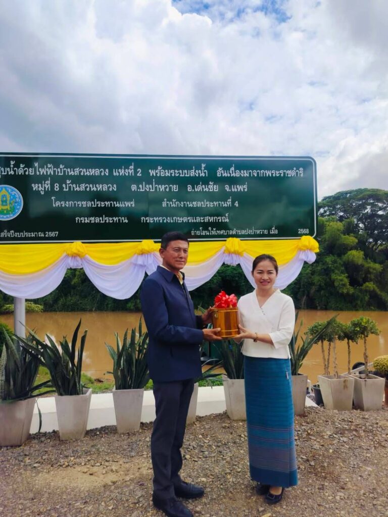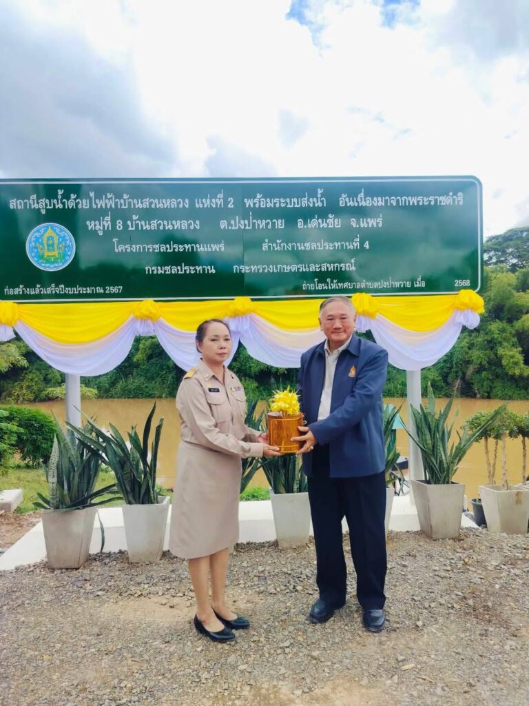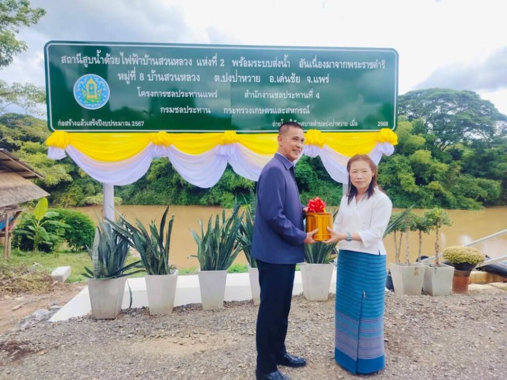 ต่อจากนั้นช่วงบ่าย องคมนตรีและคณะเดินทางไปยัง โครงการสถานีสูบน้ำด้วยไฟฟ้าบ้านสวนหลวงแห่งที่ 2 พร้อมระบบส่งน้ำ อันเนื่องมาจากพระราชดำริ ตำบลปงป่าหวาย อำเภอเด่นชัย จังหวัดแพร่ โดย ผู้อำนวยการโครงการชลประทานแพร่ ได้บรรยายสรุปผลการดำเนินของโครงการ ที่อยู่ในความรับผิดชอบของโครงการชลประทานแพร่ สำนักงานชลประทานที่ 4