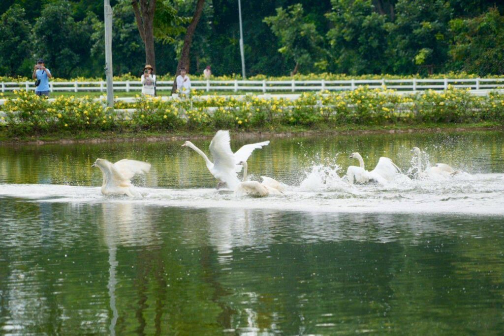 วันนี้(29ส.ค.68) เวลา 08.08 น. ที่สวนสาธารณะองค์การบริหารส่วนจังหวัดเชียงใหม่ ตำบลช้างเผือก อำเภอเมือง จังหวัดเชียงใหม่ นายพิชัย เลิศพงศ์อดิศร นายกองค์การบริหารส่วนจังหวัดเชียงใหม่ และนางสาวฐิติรัตน์ ตะวันวงศ์ รองผู้อำนวยการ สำนักงานพัฒนาพิงคนคร และผู้อำนวยการเชียงใหม่ไนท์ซาฟารี ปฏิบัติหน้าที่แทนผู้อำนวยการสำนักงานพัฒนาพิงคนคร พร้อมด้วยผู้บริหารของทั้ง 2 หน่วยงาน ร่วมกันปล่อยหงส์ขาว อายุประมาณ 1 ปี จำนวน 4 ตัว ประกอบด้วย ตัวผู้ 3 ตัว และตัวเมีย 1 ตัว ซึ่งทางเชียงใหม่ไนท์ซาฟารีให้การอนุเคราะห์สนับสนุน ลงสู่บึงน้ำของสวนสาธารณะองค์การบริหารส่วนจังหวัดเชียงใหม่ เพื่อเลี้ยงและจัดแสดงร่วมกับฝูงหงส์จำนวน 10 ตัว ประกอบด้วย หงส์ขาว 2 ตัวและหงส์ดำ 10 ตัว ที่นายพิชัย ใช้ทุนทรัพย์ส่วนตัวจัดซื้อนำมาเลี้ยงและจัดแสดงเพื่อเป็นสร้างสีสันและเติมเต็มความมีชีวิตชีวาให้กับพื้นที่แห่งนี้ที่เป็นแลนด์มาร์คและแหล่งพักผ่อนหย่อนใจของคนเชียงใหม่และนักท่องเที่ยว ซึ่งเพิ่งเริ่มปล่อยเลี้ยงเป็นวันแรกเมื่อวานนี้และเกิดกระแสบวกจากประชาชนที่ให้การตอบรับเป็นอย่างดี กระทั่งวันนี้ได้ทำการปล่อยหงส์ขาวจากไนท์ซาฟารีเพิ่มอีก 4 ตัว ซึ่งทันทีที่ทำการปล่อยปรากฏว่าหงส์ทั้งหมดสามารถปรับตัวเข้ารวมฝูงกันได้เป็นอย่างดีในเวลาไม่นาน