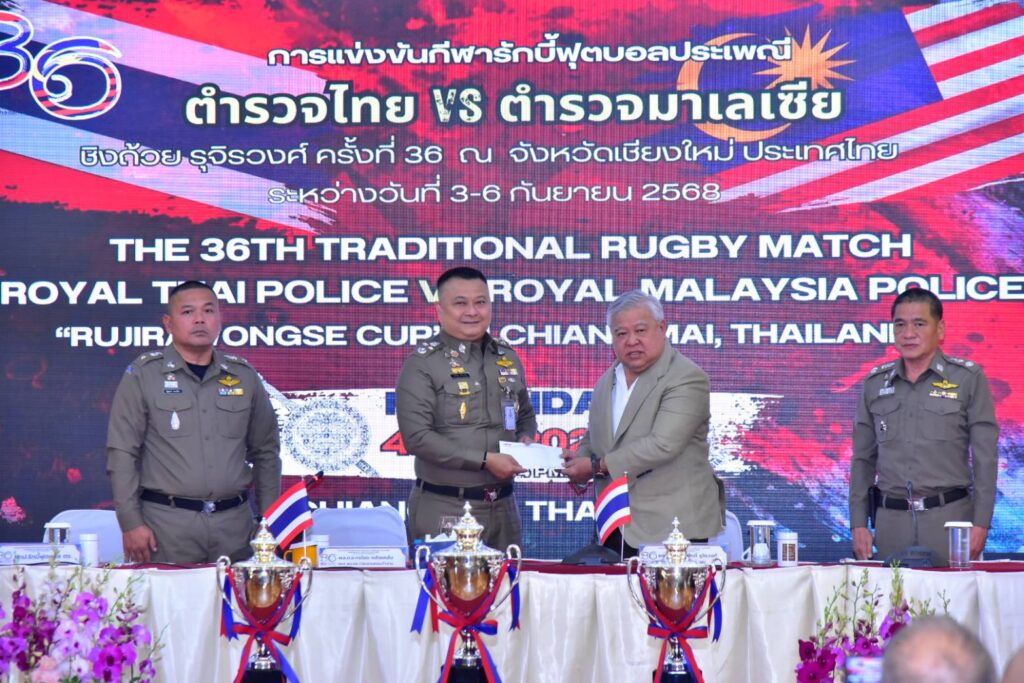 วันนี้ (29 สิงหาคม 2568) เวลา 10.30 น. พล.ต.อ.กิตติ์รัฐ พันธุ์เพ็ชร์ ผู้บัญชาการตำรวจแห่งชาติ มอบหมาย พล.ต.อ.กรไชย คล้ายคลึง รองผู้บัญชาการตำรวจแห่งชาติ ในฐานะประธานคณะทำงานการจัดการแข่งขันกีฬารักบี้ฟุตบอลประเพณีระหว่างตำรวจไทยและตำรวจมาเลเซีย พร้อมด้วย มูฮัมหมัด ฮาฟิซ อาบู บาการ์ เลขานุการเอก/ผู้ช่วยทูตตำรวจ ประจำสถานเอกอัครราชทูตมาเลเซีย ประจำประเทศไทย และ พล.ต.ต.เทอดศักดิ์ รุจิรวงศ์ ที่ปรึกษาคณะทำงานฯ แถลงข่าวการแข่งขันกีฬารักบี้ฟุตบอลประเพณีระหว่างตำรวจไทยและตำรวจมาเลเซีย ชิงถ้วยรุจิรวงศ์ ครั้งที่ 36 ประจำปี 2568 ณ ห้องสารสิน อาคาร 1 สำนักงานตำรวจแห่งชาติ