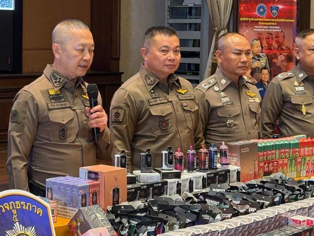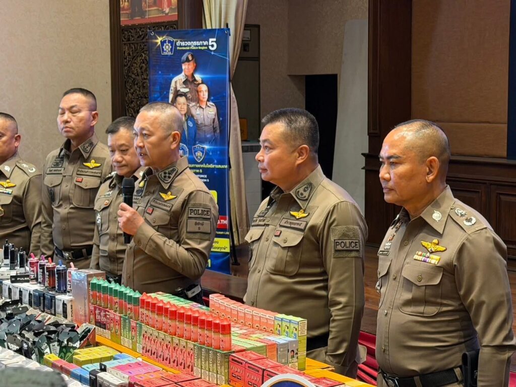 เมื่อวันที่ 28 ตุลาคม 2568 #ที่ตำรวจภูธรภาค 5 พล.ต.อ.ธัชชัย ปิตะนีละบุตร รองผู้บัญชาการตำรวจแห่งชาติ ( รอง ผบ.ตร. ) พล.ต.ท.ยิ่งยศ เทพจำนงค์ ผู้ช่วย ผบ.ตร. พร้อม พล.ต.ท.กฤตธาพล ยี่สาคร ผบช.ภ.5 แถลงตำรวจภูธรภาค 5 โดยศูนย์ปราบปรารมอาชญากรรมทางเทคโนโลยีสารสนเทศ ตำรวจภูธรภาค 5 และกองบังคับการสืบสวนสอบสวน ภ.5 เปิดปฏิบัติการบุกค้นรังจำหน่ายบุหรี่ไฟฟ้าผ่านออนไลน์ เครือข่าย VAPEHAUS 3 จุด กลางเมืองเชียงใหม่ รวบ 2 ผู้ต้องหา พร้อมของกลางบุหรี่ไฟฟ้า 36,555 ชิ้น มูลค่ากว่า 6,600,000 บาท พร้อมดำเนินการปิดการเข้าถึงเว็บไซต์ และกำลังขยายผลไปถึงนายทุน