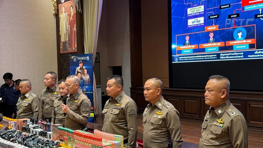 เชียงใหม่-รอง ผบ.ตร. – ผู้ช่วย ผบ.ตร. แถลง ภ.5 ทลายแก๊งค้าบุหรี่ไฟฟ้าออนไลน์ผ่านเว็บ – ไลน์แอด ค้น 3 จุดเชียงใหม่ ยึดของกลางเพียบ รวบ 2 สาวดำเนินคดีขยายผลนายทุน