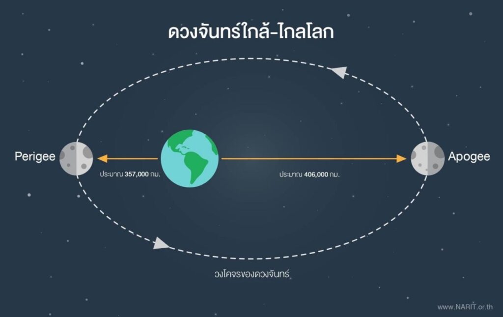 นายศุภฤกษ์ กล่าวเพิ่มเติมว่า ปกติแล้วดวงจันทร์ใช้เวลาโคจรรอบโลกประมาณ 1 เดือน และมีรูปแบบการโคจรเป็นวงรี ส่งผลให้ในแต่ละเดือนดวงจันทร์จะมีตำแหน่งที่ใกล้โลกที่สุด เรียกว่า เปริจี (Perigee) มีระยะทางเฉลี่ยประมาณ 357,000 กิโลเมตร และตำแหน่งที่ไกลโลกที่สุด เรียกว่า อะโปจี (Apogee) มีระยะทางเฉลี่ยประมาณ 406,000 กิโลเมตร การที่คนบนโลกสังเกตเห็นดวงจันทร์มีขนาดเล็กหรือใหญ่กว่าปกตินั้น เป็นเหตุการณ์ที่สามารถอธิบายได้ตามหลักวิทยาศาสตร์